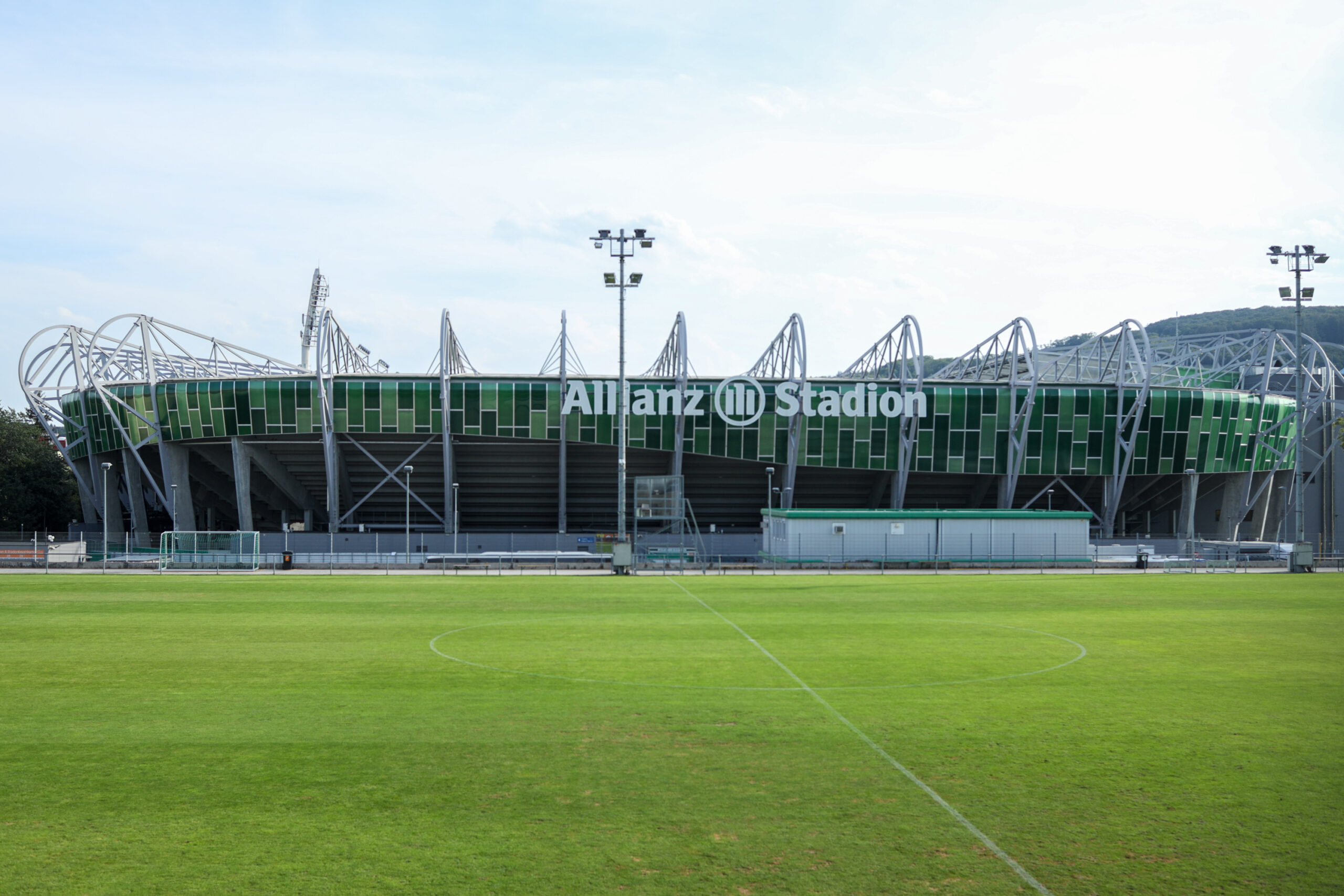 Allianz Arena położona jest w dzielnicy Penzing, w dystrykcie Huetteldorf. Niedaleko Pałacu Schoenbrunn, dawnej letniej rezydencji Habsburgów. Jednego z najpiękniejszych barokowych obiektów w Europie, który ze względu na historyczne znaczenie, wyjątkowy park oraz imponującą aranżację przestrzeni należy do Światowego Dziedzictwa Kulturowego UNESCO. Stadion trudno z nim porównywać, ale trzeba przyznać, że również jest imponujący w swojej skali. Jego elewacja pokryta jest zieloną mozaiką z przepuszczających światło paneli, częściowo obejmujących również dach. Wnętrze sprawia przyjazne wrażenie, a widoczność z każdego z ponad 28 tysięcy miejsc jest bardzo dobra. Jak ujawnił jednak choćby mecz z Wisłą, ma też swoje niedoskonałości.
