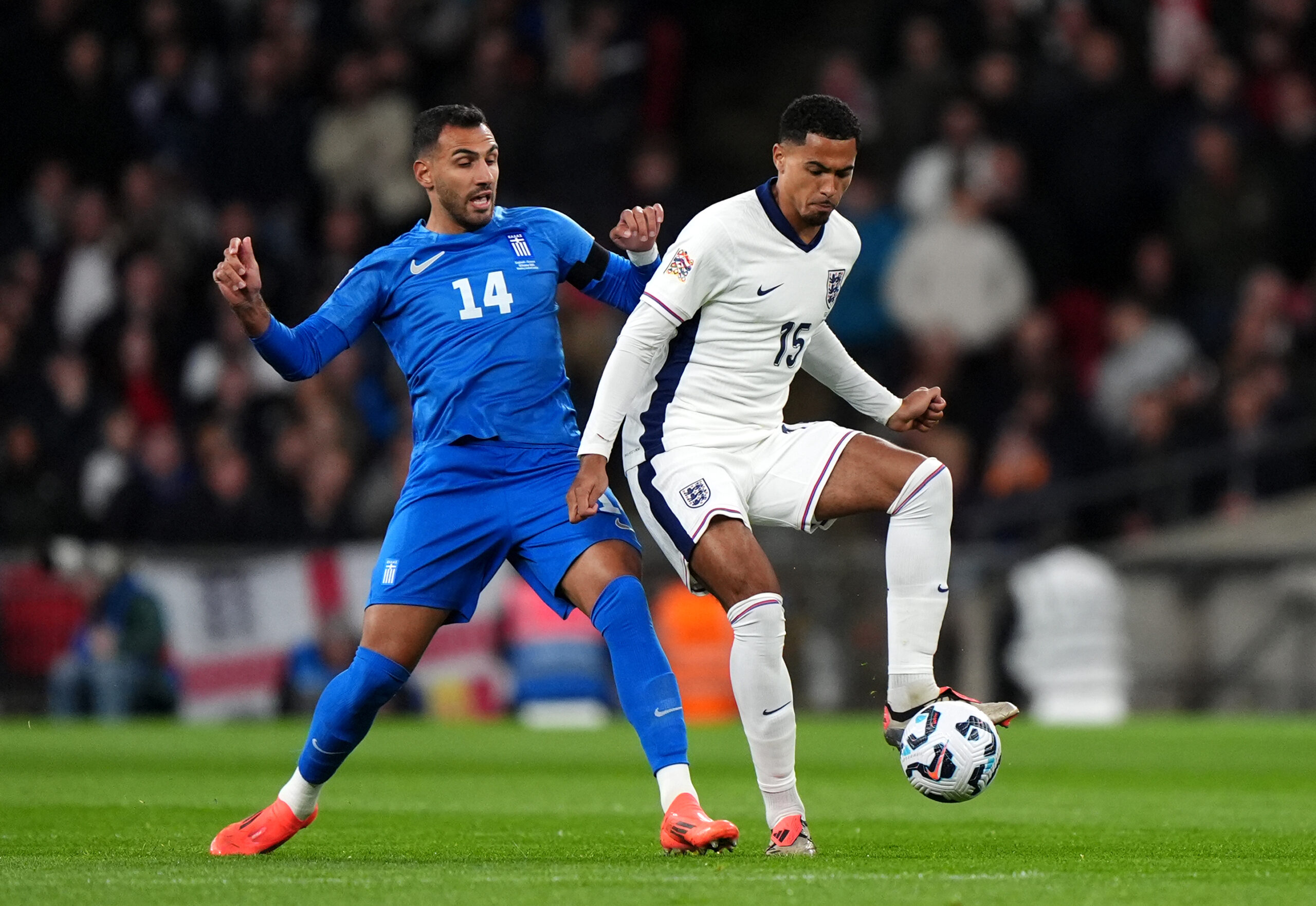Greece's Evangelos Pavlidis (left) and England's Levi Colwill battle for the ball during the UEFA Nations League Group B2 match at Wembley Stadium, London. Picture date: Thursday October 10, 2024.,Image: 919198399, License: Rights-managed, Restrictions: Use subject to FA restrictions. Editorial use only. Commercial use only with prior written consent of the FA. No editing except cropping., Model Release: no, Credit line: Bradley Collyer / PA Images / Forum