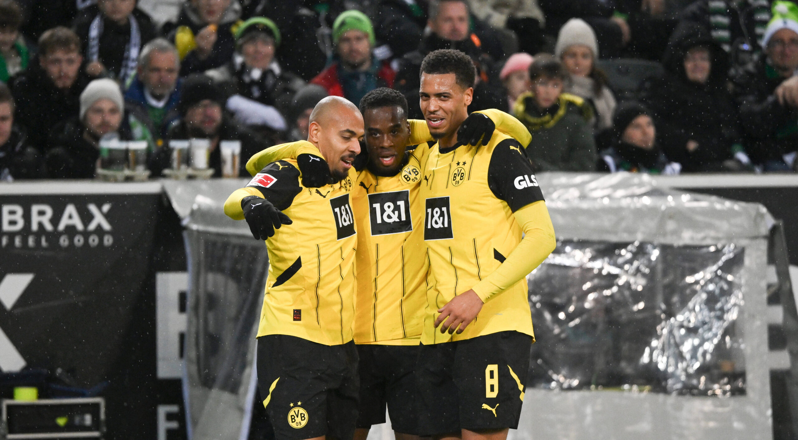 Jubel 0:1 v.li., Donyell Malen Borussia Dortmund, Jamie Gittens Borussia Dortmund, Felix Nmecha Borussia Dortmund 07.12.2024, Fussball 1. Bundesliga, 13. Spieltag, Saison 2024/2025 Borussia Monchengladbach - Borussia Dortmund Moenchengladbach Borussia Park Nordrhein Westfalen Deutschland *** Cheers 0 1 v li , Donyell Malen Borussia Dortmund , Jamie Gittens Borussia Dortmund , Felix Nmecha Borussia Dortmund 07 12 2024, Football 1 Bundesliga, Matchday 13, Season 2024 2025 Borussia Monchengladbach Borussia Dortmund Moenchengladbach Borussia Park Nordrhein Westfalen Germany Team2