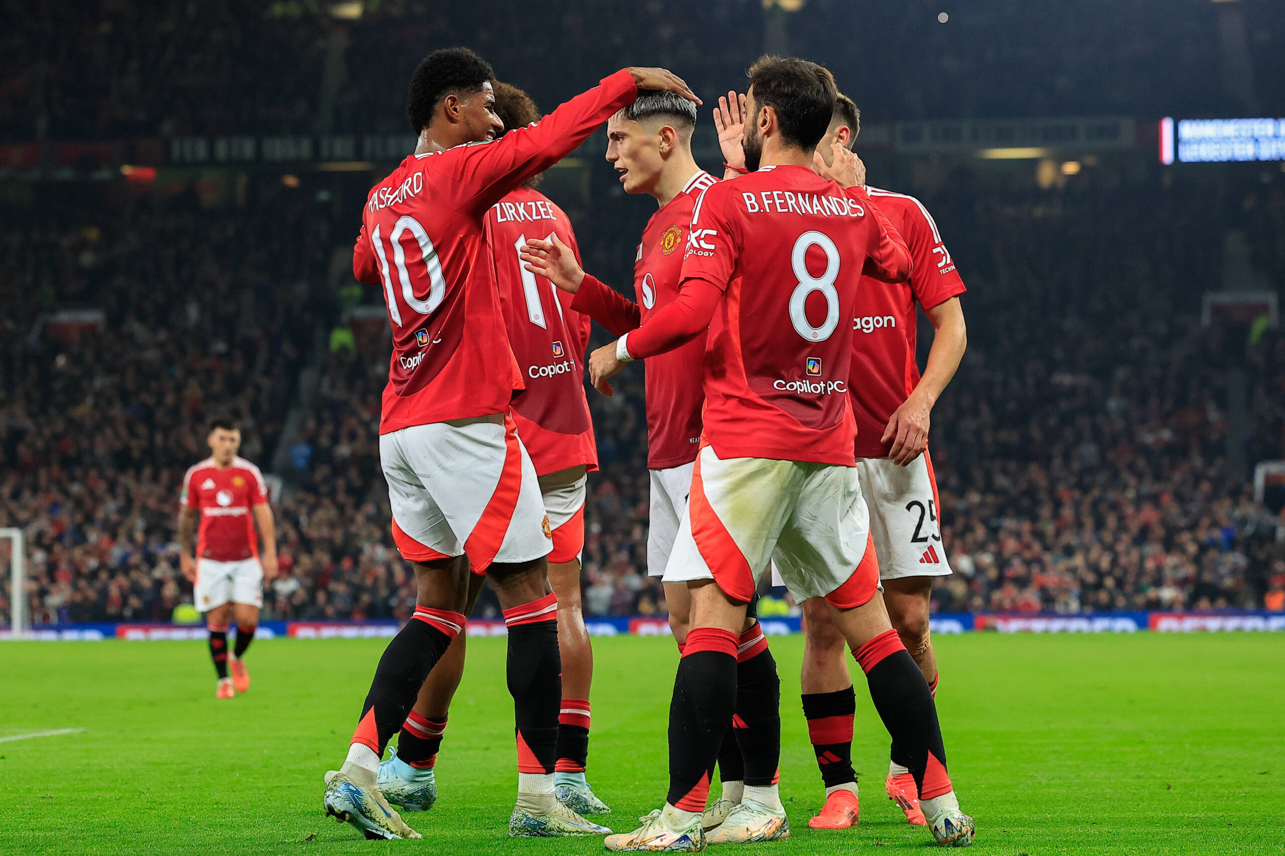 Manchester United, ManU v Leicester City EFL Cup 30/10/2024. Alejandro Garnacho 17 of Manchester United celebrates scoring to make it 2-0 during the EFL Cup match between Manchester United and Leicester City at Old Trafford, Manchester, England on 30 October 2024. Manchester Old Trafford Greater Manchester England Editorial use only DataCo restrictions apply See www.football-dataco.com , Copyright: xConorxMolloyx PSI-20709-0046