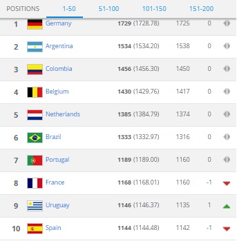 W rankingu w dalszym ciągu prowadzą mistrzowie świata – Niemcy. Za ich plecami plasują się: Argentyna, Kolumbia, Belgia i Holandia. Spadek zaliczyły reprezentacje Francji oraz Hiszpanii.