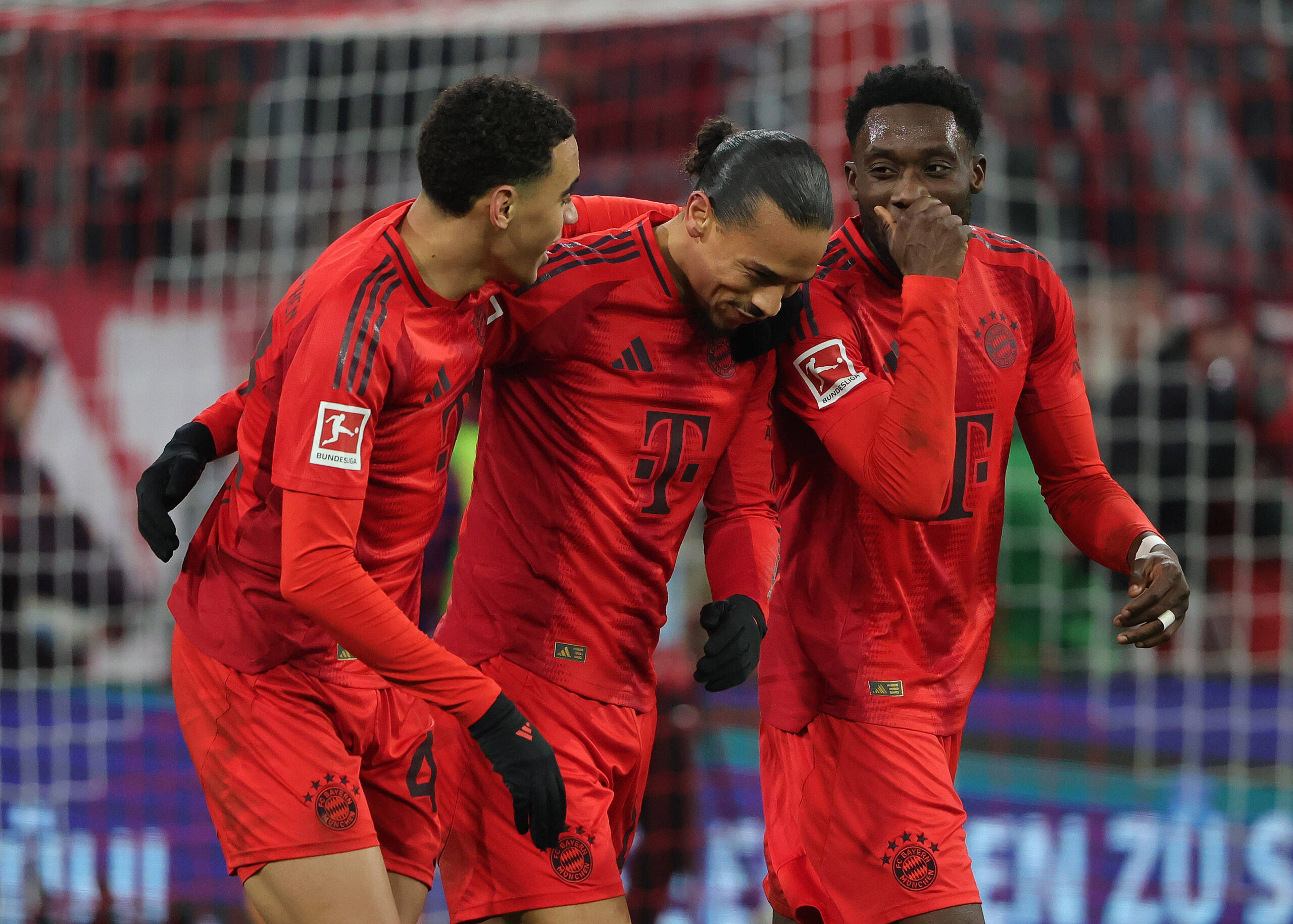 20.12.2024, FC Bayern vs RB Leipzig, Allianz Arena Muenchen, Fussball, im Bild: 3 Torschuetze Jamal Musiala FC Bayern Muenchen, Leroy Sane FC Bayern Muenchen und Alphons Davies FC Bayern Muenchen *** 20 12 2024, FC Bayern vs RB Leipzig, Allianz Arena Muenchen, Soccer, Sports, in the picture 3 Goalkeepers Jamal Musiala FC Bayern Muenchen , Leroy Sane FC Bayern Muenchen and Alphons Davies FC Bayern Muenchen