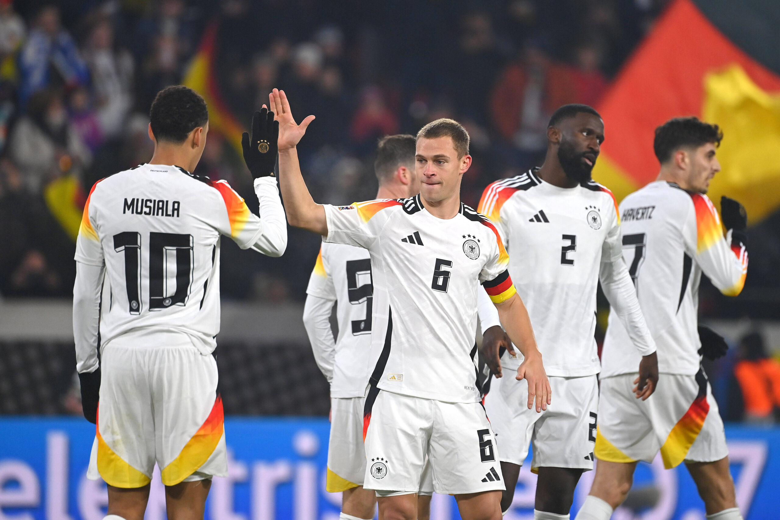 v.li:Jamal MUSIALA GER, Joshua KIMMICH GER, Pascal GROSS GER, Antonio Ruediger GER,Kai HAVERTZ GER, Jubel,Freude,Begeisterung,Aktion. Fussball UEFA Nations League Deutschland GER - Bosnien - Herzegowina BIH 7-0 am 16.10.2024 im Europa Parks Stadion Freiburg, *** from left Jamal MUSIALA GER , Joshua KIMMICH GER , Pascal GROSS GER , Antonio Ruediger GER ,Kai HAVERTZ GER , cheering,joy,enthusiasm,action Football UEFA Nations League Germany GER Bosnia Herzegovina BIH 7 0 on 16 10 2024 at Europa Parks Stadium Freiburg,