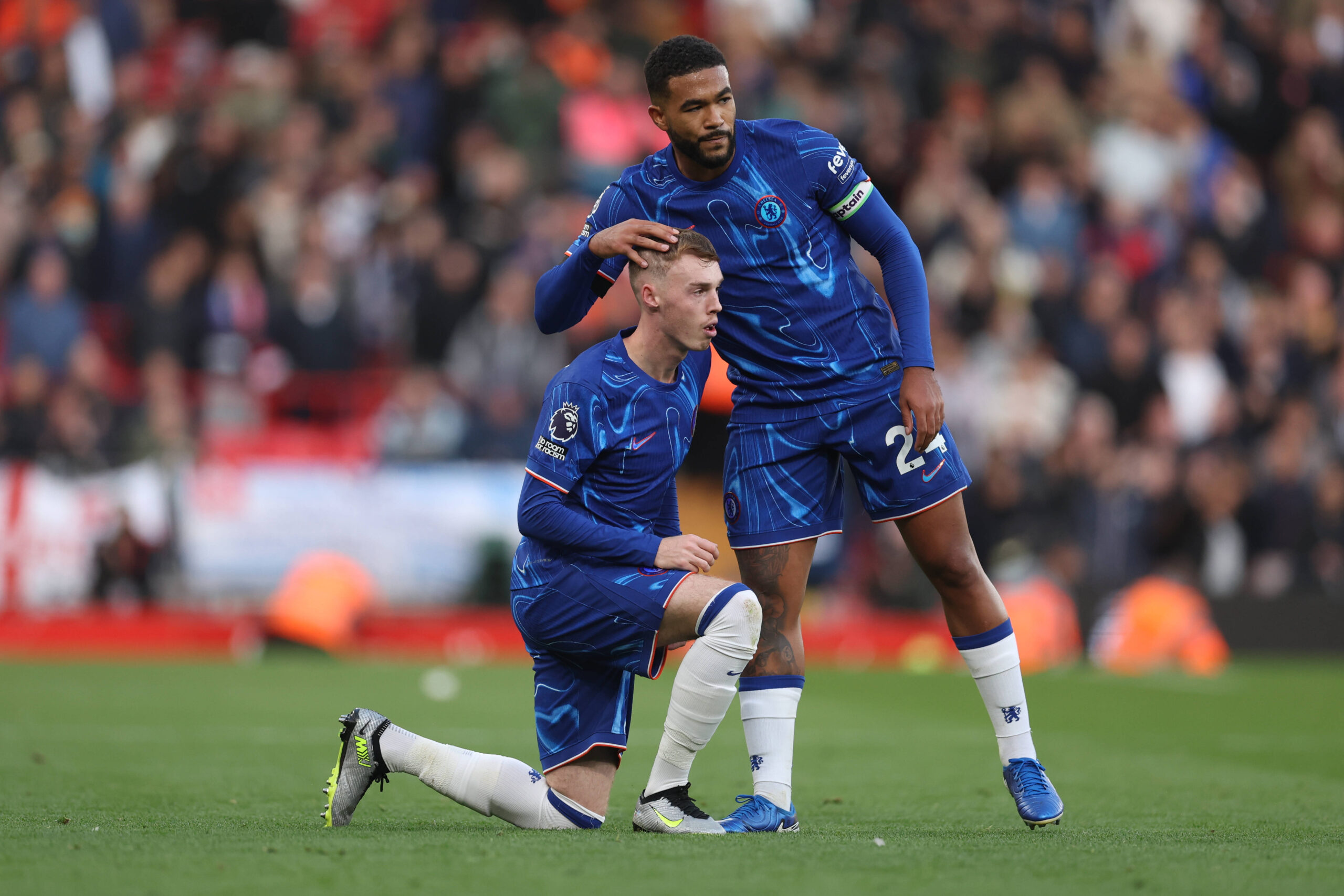 Football - 2024 / 2025 Premier League - Liverpool v Chelsea - Anfield - Sunday 20th October 2024 Cole Palmer of Chelsea and Reece James PUBLICATIONxNOTxINxUK
