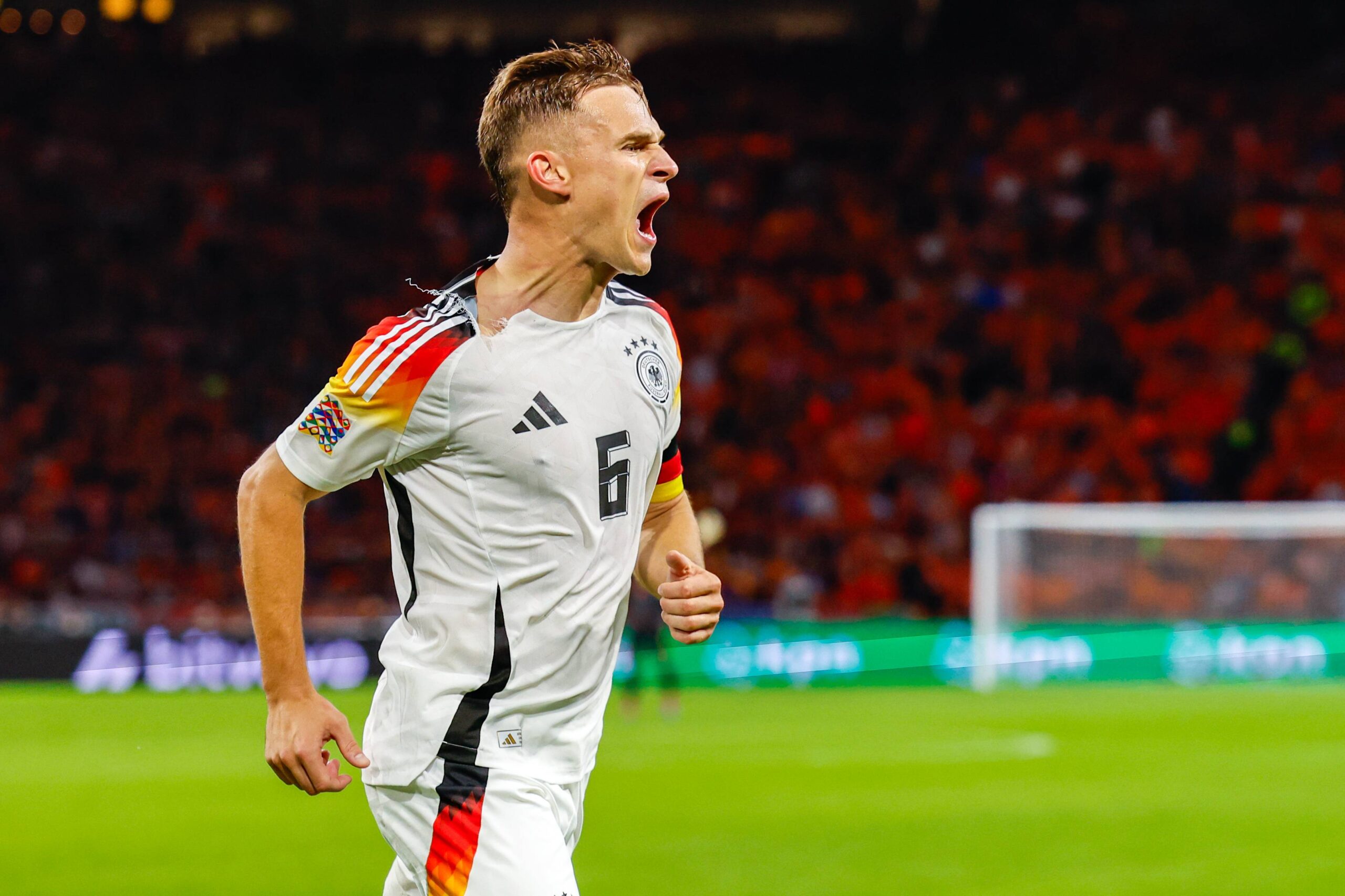 Joshua Kimmich of Germany celebrating the 1-2 during the UEFA Nations League 2024/2025 League A - Group 3 match between Netherlands and Germany at Johan Cruijff ArenA on September 10, 2024 in Amsterdam, Netherlands.  (Photo by Marcel ter Bals/DeFodi Images)