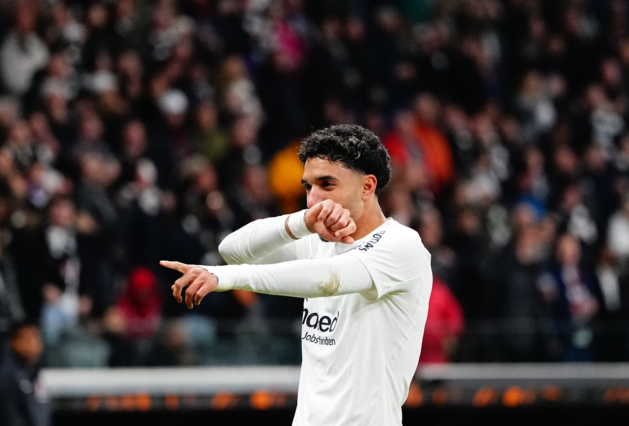 November 07 2024: Omar Marmoush of Eintracht Frankfurt  celebrate during a Europa League Round 4 game, Eintracht Frankfurt versus SK Sla Prague, at Deutsche Bank Park, Frankfurt, Germany. Ulrik Pedersen/CSM/Sipa USA (Credit Image: © Ulrik Pedersen/Cal Sport Media/Sipa USA)