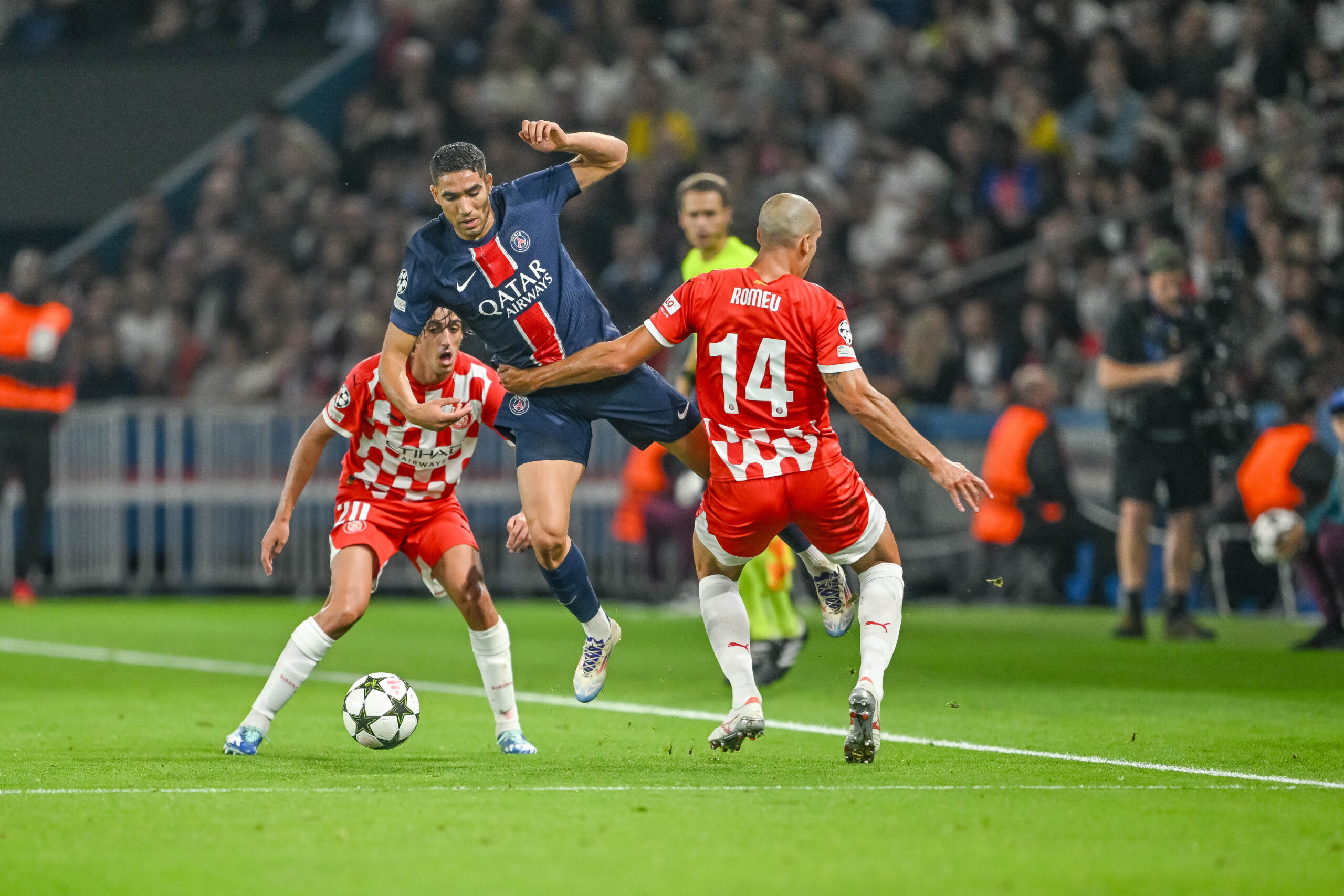 Bryan Gil (FC Girona), Achraf Hakimi (Paris Saint-Germain) und Oriol Romeu (FC Girona) battle for the ball during the UEFA Champions League 2024/25 League Phase MD1 match between Paris Saint-Germain and Girona FC at Parc des Princes on September 18, 2024 in Paris, France.  (Photo by Harry Langer/DeFodi Images)