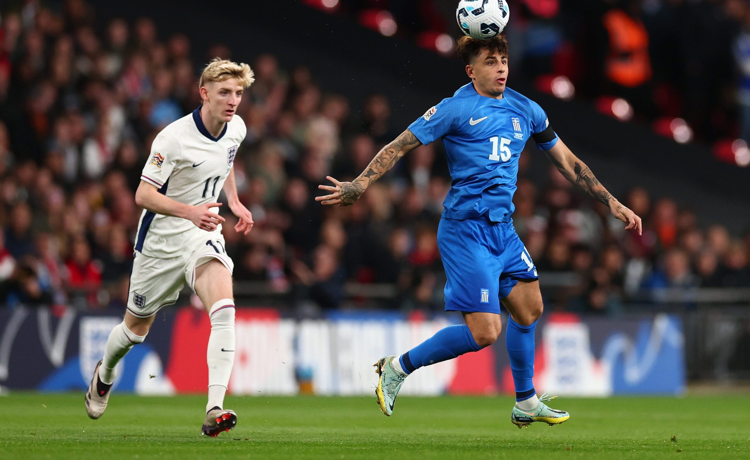 October 10, 2024, London, London, United Kingdom: 10th October 2024; Wembley Stadium, London, England; Nations League, League B, Group 2 International Football, England versus Greece; Lazaros Rota of Greece takes on Anthony Gordon of England (Credit Image:  Shaun Brooks/Action Plus Sports via ZUMA Press Wire)