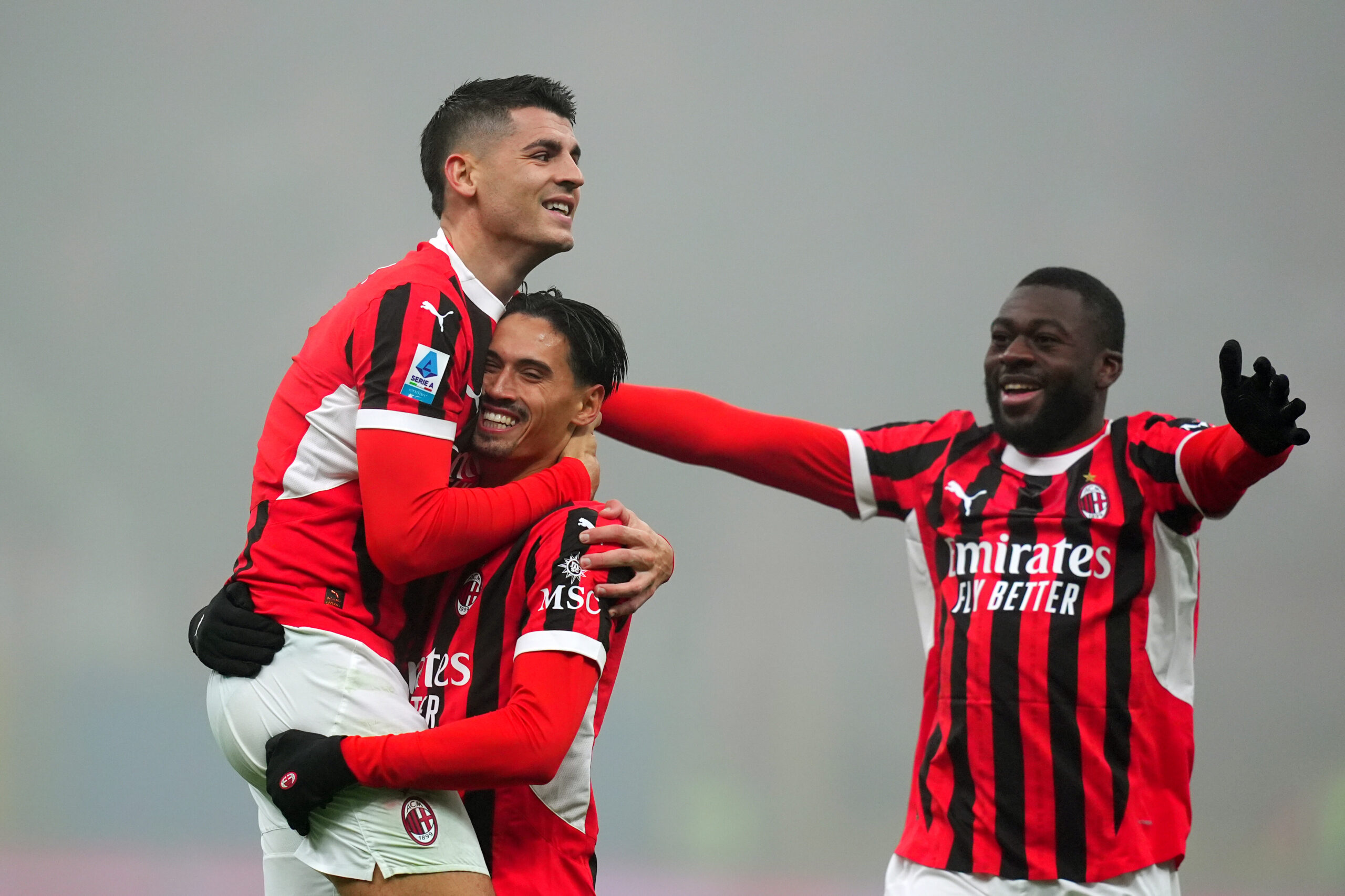 AC Milan's Tijjani Reijnders and AC MilanÕs Alvaro Morata  celebrates after scoring 3-0 during  the Serie A soccer match between Milan and Empoli at San Siro  Stadium in Milan  , North Italy - Saturday  , November 30  , 2024. Sport - Soccer . (Photo by Spada/LaPresse) (Photo by Spada/LaPresse/Sipa USA)