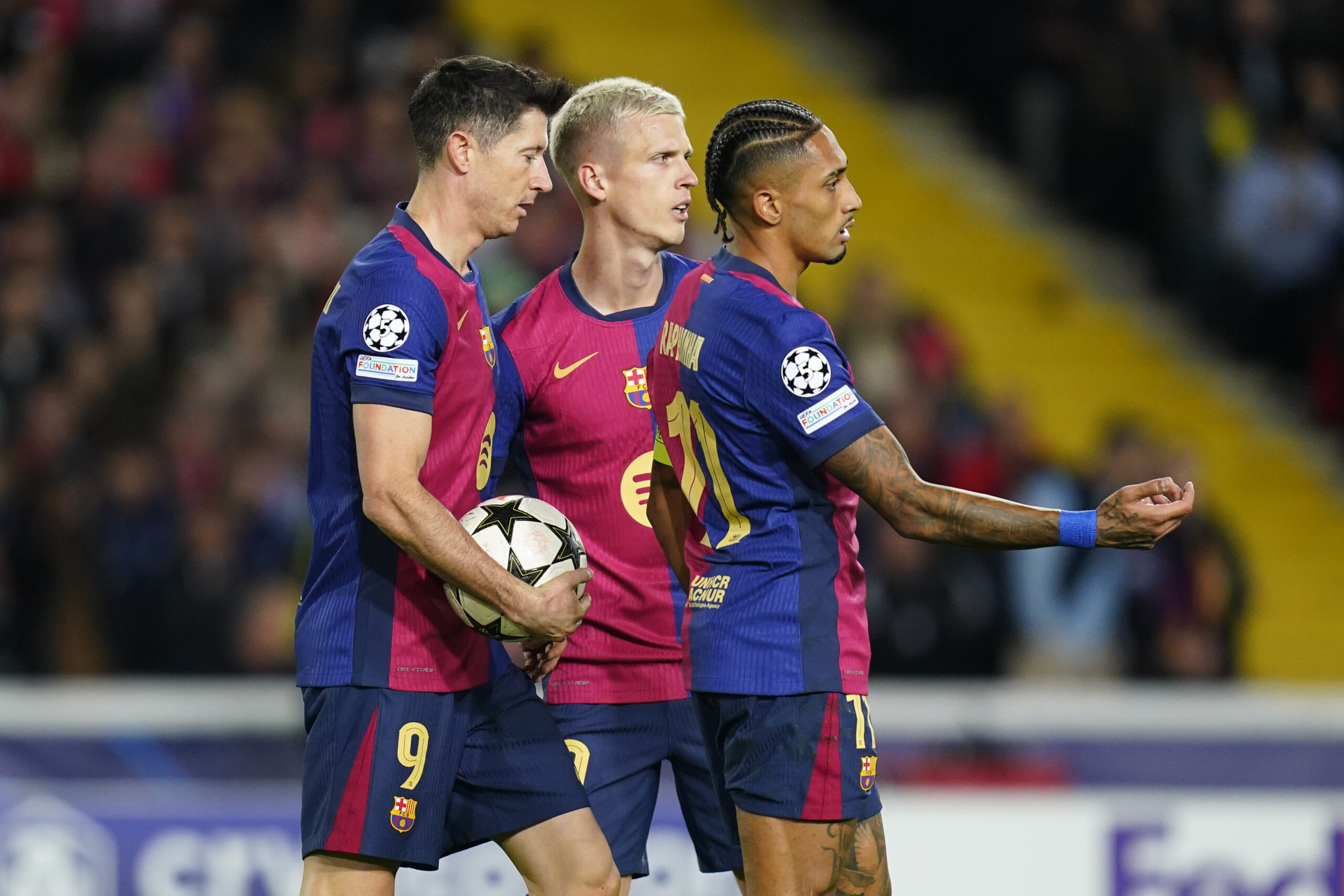 Robert Lewandowski with Raphael Dias Belloli Raphinha and Dani Olmo of FC Barcelona  during the UEFA Champions League match, date 5 between FC Barcelona and Stade Brestois played at Lluis Companys Stadium on November 26, 2024 in Barcelona, Spain. (Photo by Sergio Ruiz / Imago)  (Photo by pressinphoto/Sipa USA)