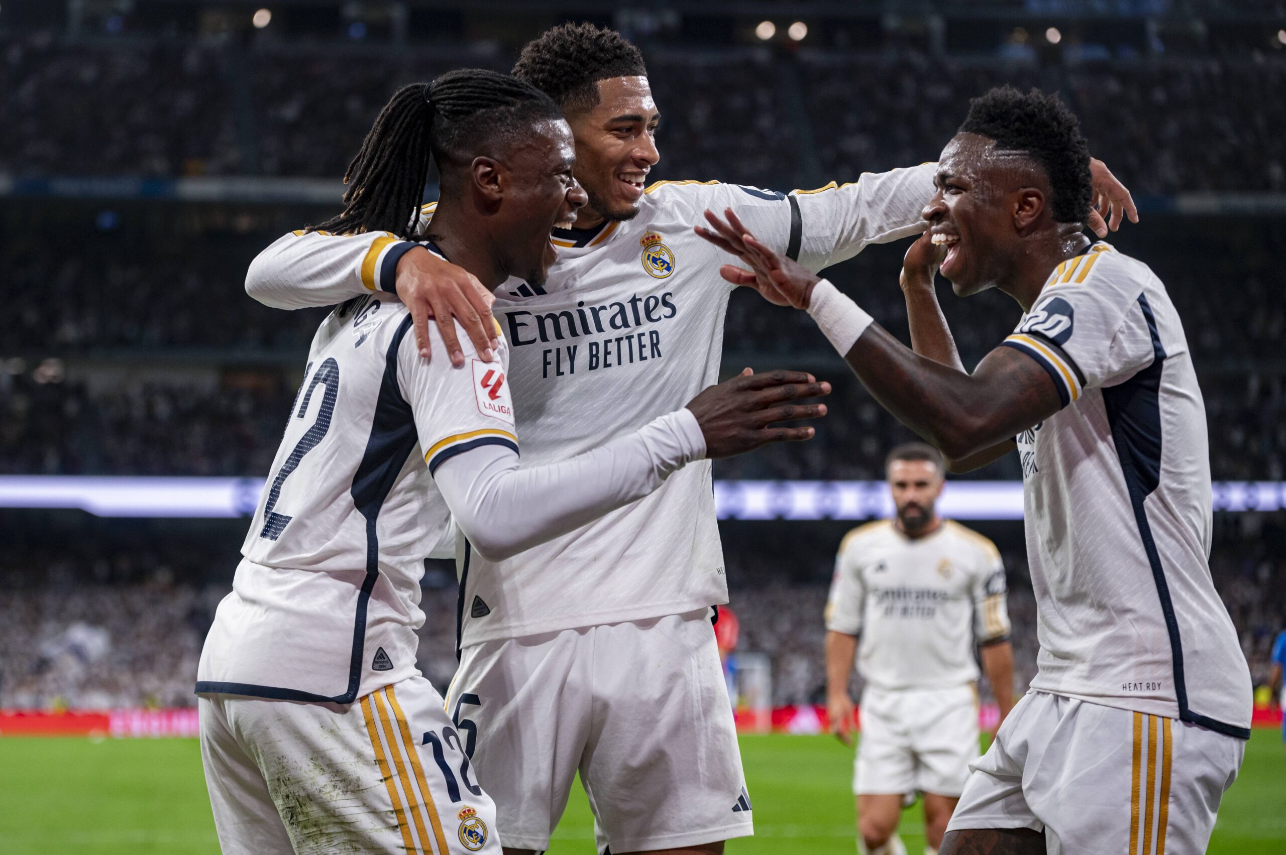 May 14, 2024, Madrid, Madrid, Spain: MADRID, SPAIN - MAY 14: Eduardo Camavinga (L), Jude Bellingham (C) and Vinicius Junior (R) of Real Madrid celebrates a goal during the La Liga EA Sports 2023/24 football match between Real Madrid vs Deportivo Alaves at Estadio Santiago Bernabeu on May 14, 2024 in Madrid, Spain. (Credit Image: © Alberto Gardin/ZUMA Press Wire)