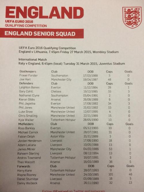 Synowie Albionu zmierzą się z Litwą 27 marca (eliminacje Euro 2016), a cztery dni później zagrają w Turynie z Włochami (spotkanie towarzyskie).