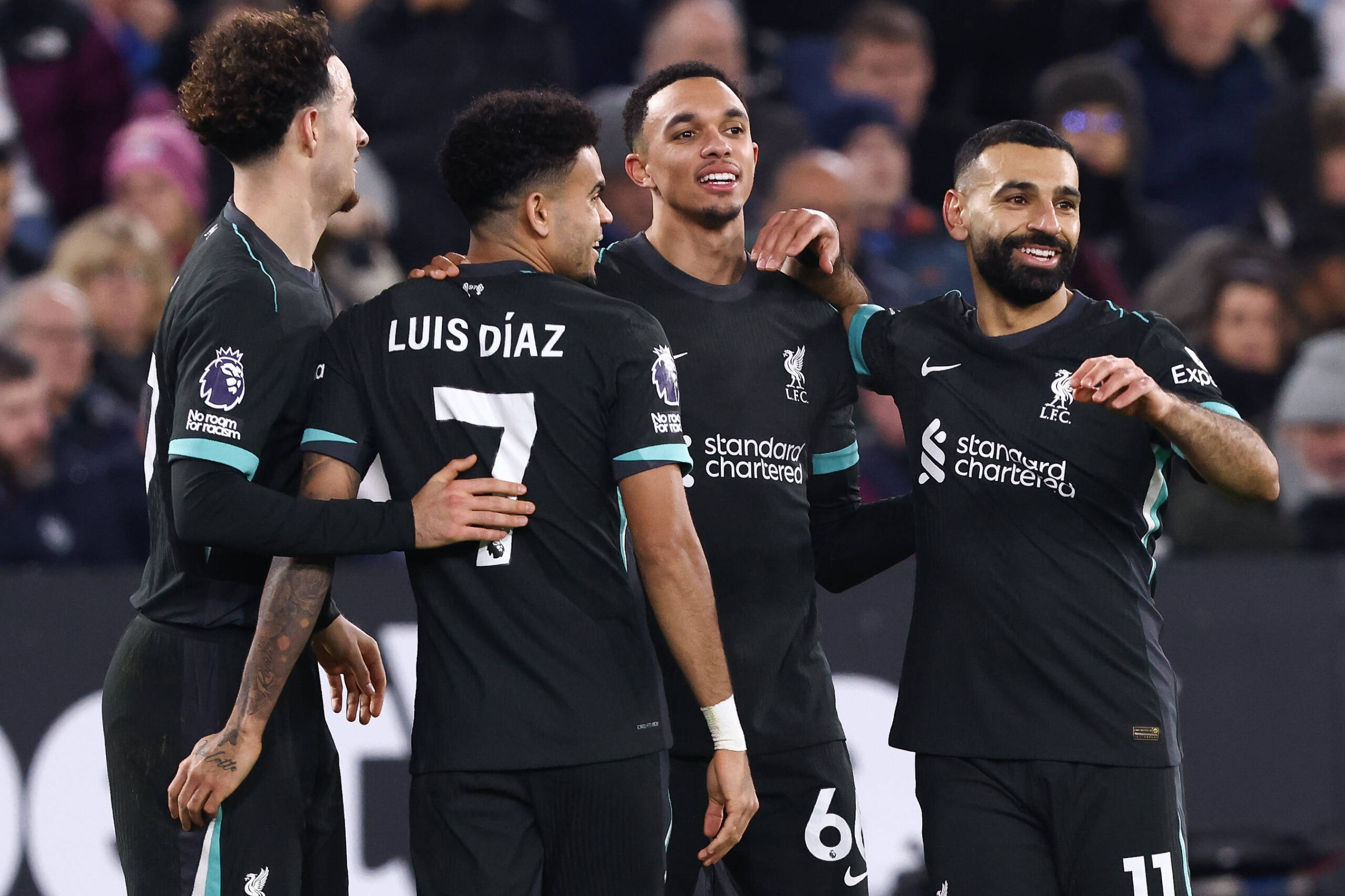 West Ham United v Liverpool Premier League 29/12/2024. GOAL 0-4 Trent Alexander-Arnold of Liverpool scores a goal and celebrates with Mohamed Salah of Liverpool and Luis Diaz of Liverpool and Curtis Jones of Liverpool during the Premier League match between West Ham United and Liverpool at the London Stadium, London, England on 29 December 2024. London London Stadium England Editorial use only DataCo restrictions apply See www.football-dataco.com , Copyright: xPaulxPhelanx PSI-21150-0022