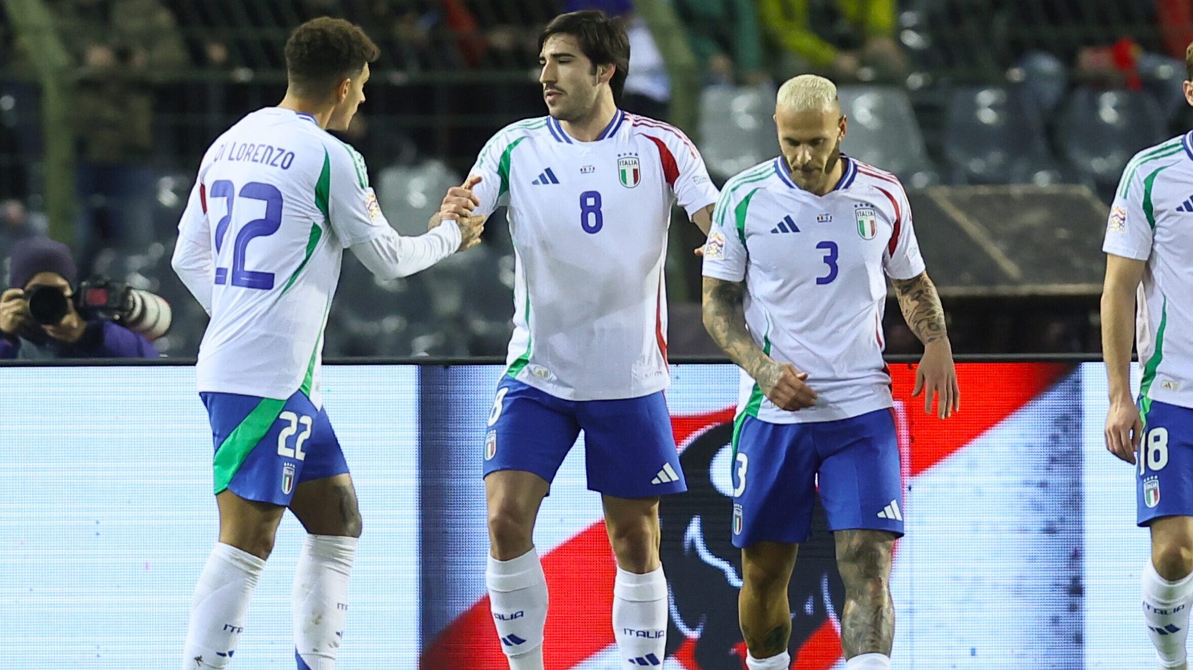 Italian Sandro Tonali celebrates after scoring during a soccer game between Belgian national soccer team Red Devils and Italy, match 5 (out of 6) in the League A Group 2 of the UEFA Nations League 2025 competition, Thursday 14 November 2024 in Brussels. BELGA PHOTO BRUNO FAHY (Photo by BRUNO FAHY/Belga/Sipa USA)