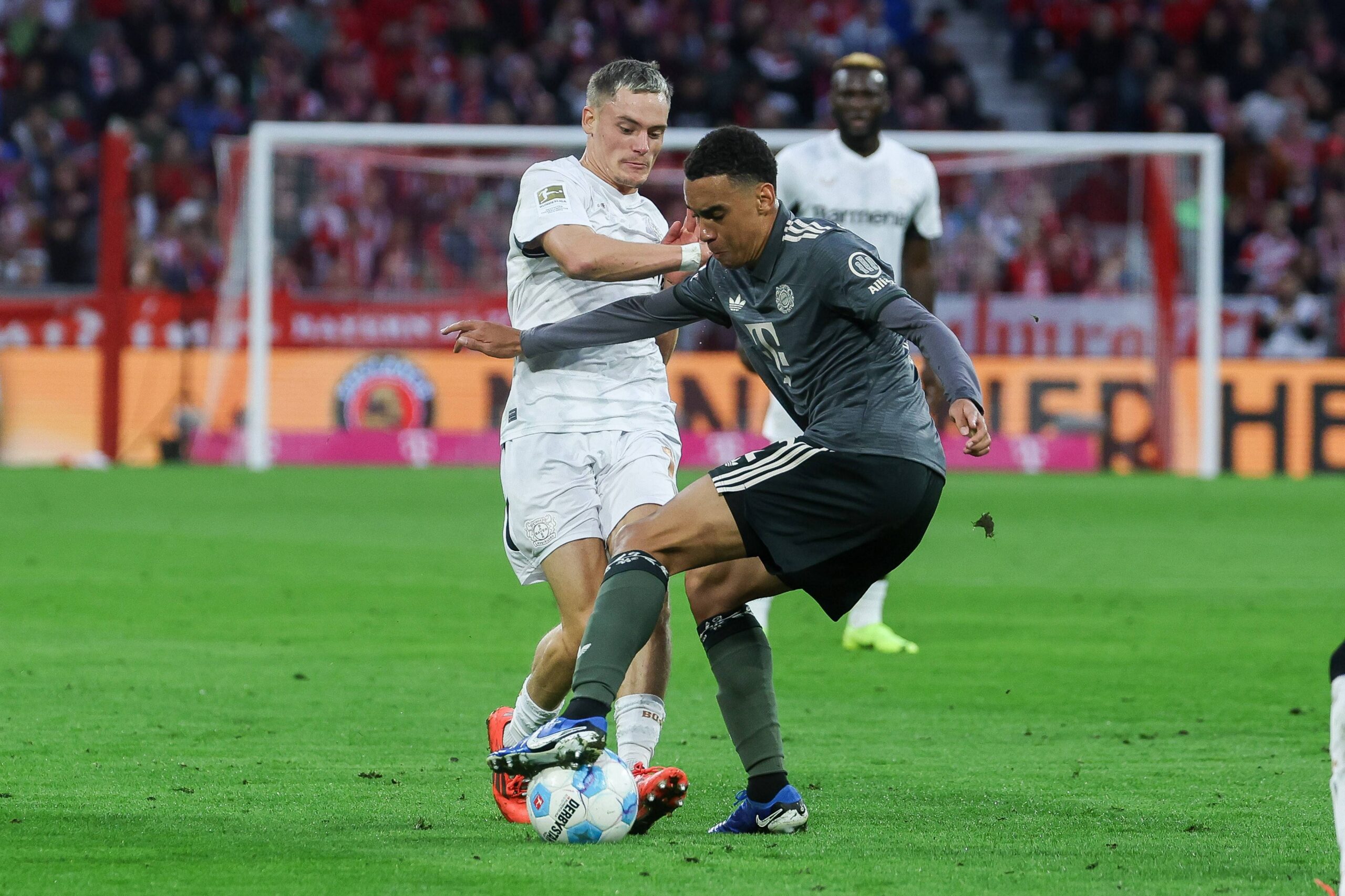 im Zweikampf, Aktion, mit Florian Wirtz 10 Bayer 04 Leverkusen, Jamal Musiala 42 FC Bayern Muenchen, FC Bayern Muenchen vs. Bayer 04 Leverkusen, Fussball, 1. Bundesliga, 5. Spieltag, 28.09.2024 DFB regulations prohibit any use of photographs as image sequences and/or quasi-video Muenchen Bayern Deutschland *** in duel, action, with Florian Wirtz 10 Bayer 04 Leverkusen , Jamal Musiala 42 FC Bayern Muenchen , FC Bayern Muenchen vs Bayer 04 Leverkusen, Soccer, 1 Bundesliga, 5 Matchday, 28 09 2024 DFB regulations prohibit any use of photographs as image sequences and or quasi video Muenchen Bayern Germany Copyright: xkolbert-press/ChristianxKolbertx