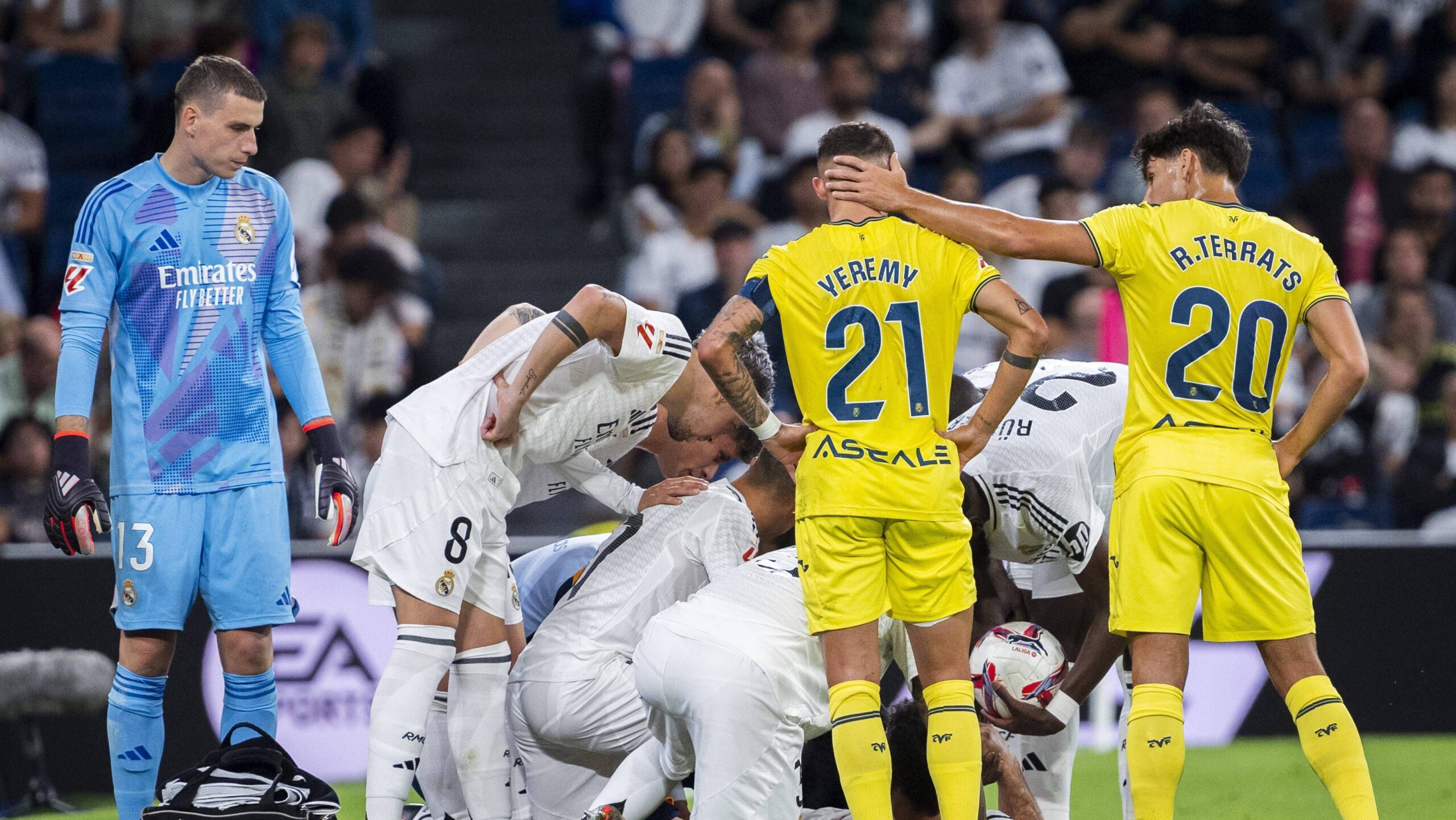October 5, 2024, Madrid, Madrid, Spain: A large group of players from both teams gather around the injured player Daniel Carvajal of Real Madrid CF that seen on the ground during the La Liga EA Sports 2024/25 football match between Real Madrid CF vs Villarreal CF at Estadio Santiago Bernabeu on October 05, 2024 in Madrid, Spain. (Credit Image:  Alberto Gardin/ZUMA Press Wire)