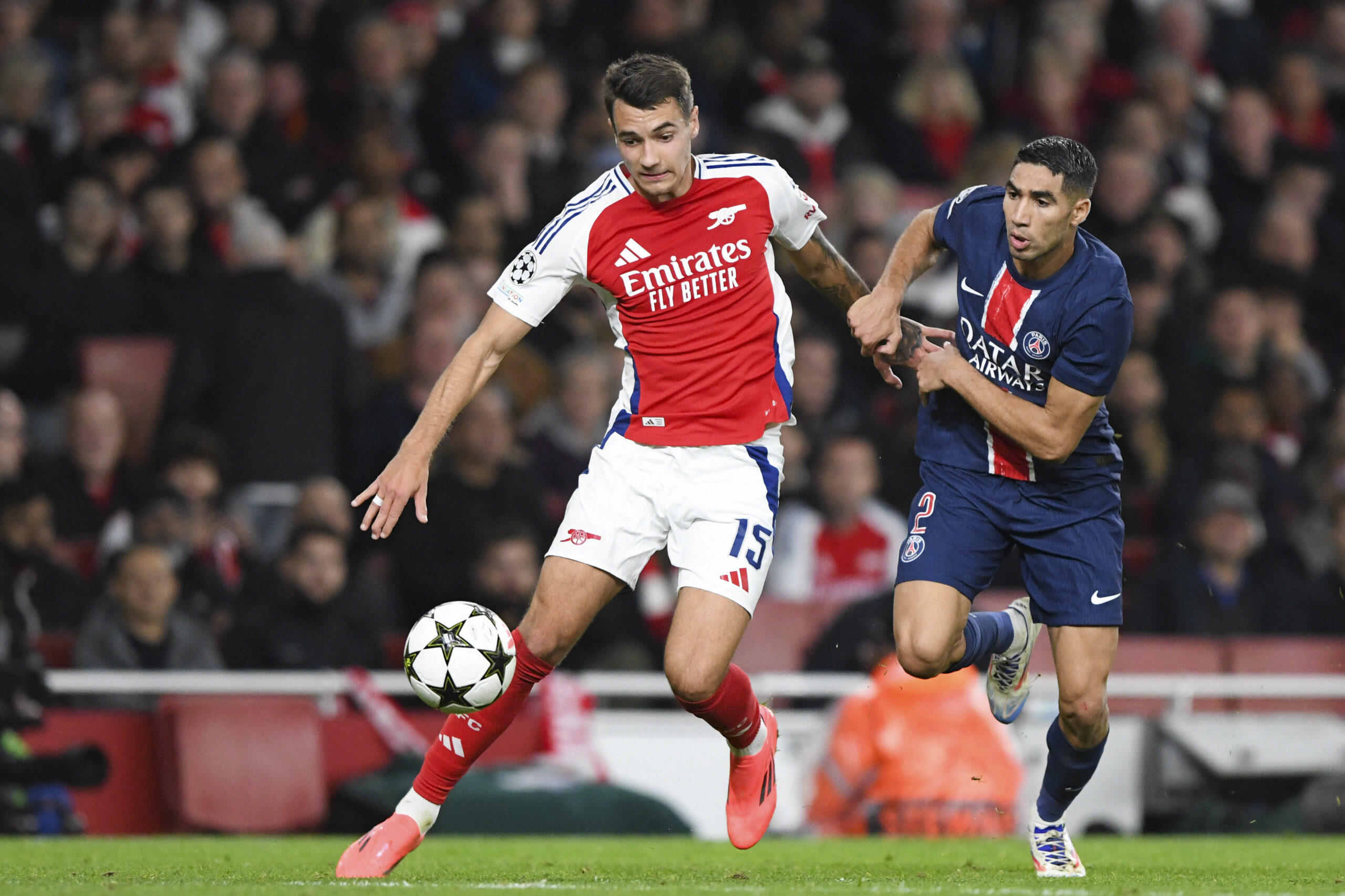 LONDON, ENGLAND - OCTOBER 1: Jakub Kiwior of Arsenal (L) is chased by Achraf Hakimi of Paris Saint Germain (R) during the UEFA Champions League 2024/25 League Phase MD2 match between Arsenal FC and Paris Saint-Germain at Emirates Stadium on October 1, 2024 in London, England. - photo :  Will Palmer/SPP / Will Palmer / Panoramic / SIPA /297904_0079//Credit:Panoramic/SIPA/2410020002