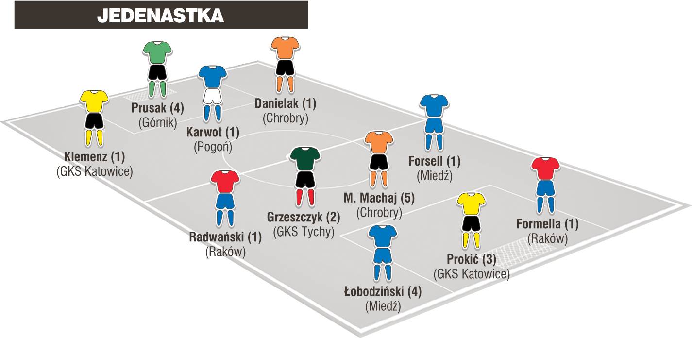 Niezauważone nie mogło przejść zwycięstwo GKS-u Katowice w meczu na szczycie tabeli. Śląski zespół wygrał w Suwałkach z Wigrami 2:0, więc w jedenastce kolejki znalazło się dwóch jego przedstawicieli. Tyle samo zawodników nominowaliśmy z Chrobrego Głogów, Miedzi Legnica i Rakowa Częstochowa.