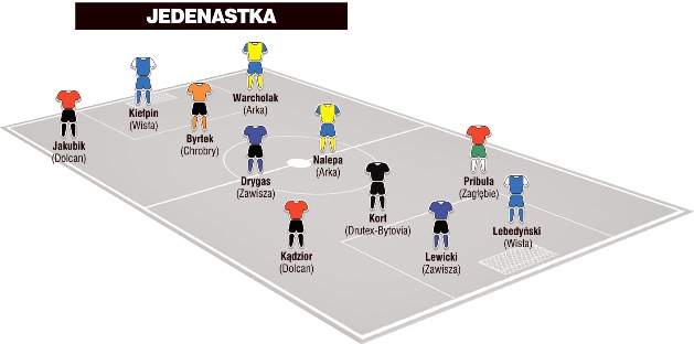 Po dwóch zawodników do „jedenastki” jesieni wprowadziły: Arka Gdynia (Warcholak i Nalepa), Dolca Ząbki (Jakubik i Kądzior), Zawisza Bydgoszcz (Drygas i Lewicki) oraz Wisła Płock (Lebedyński i Kiełpin)