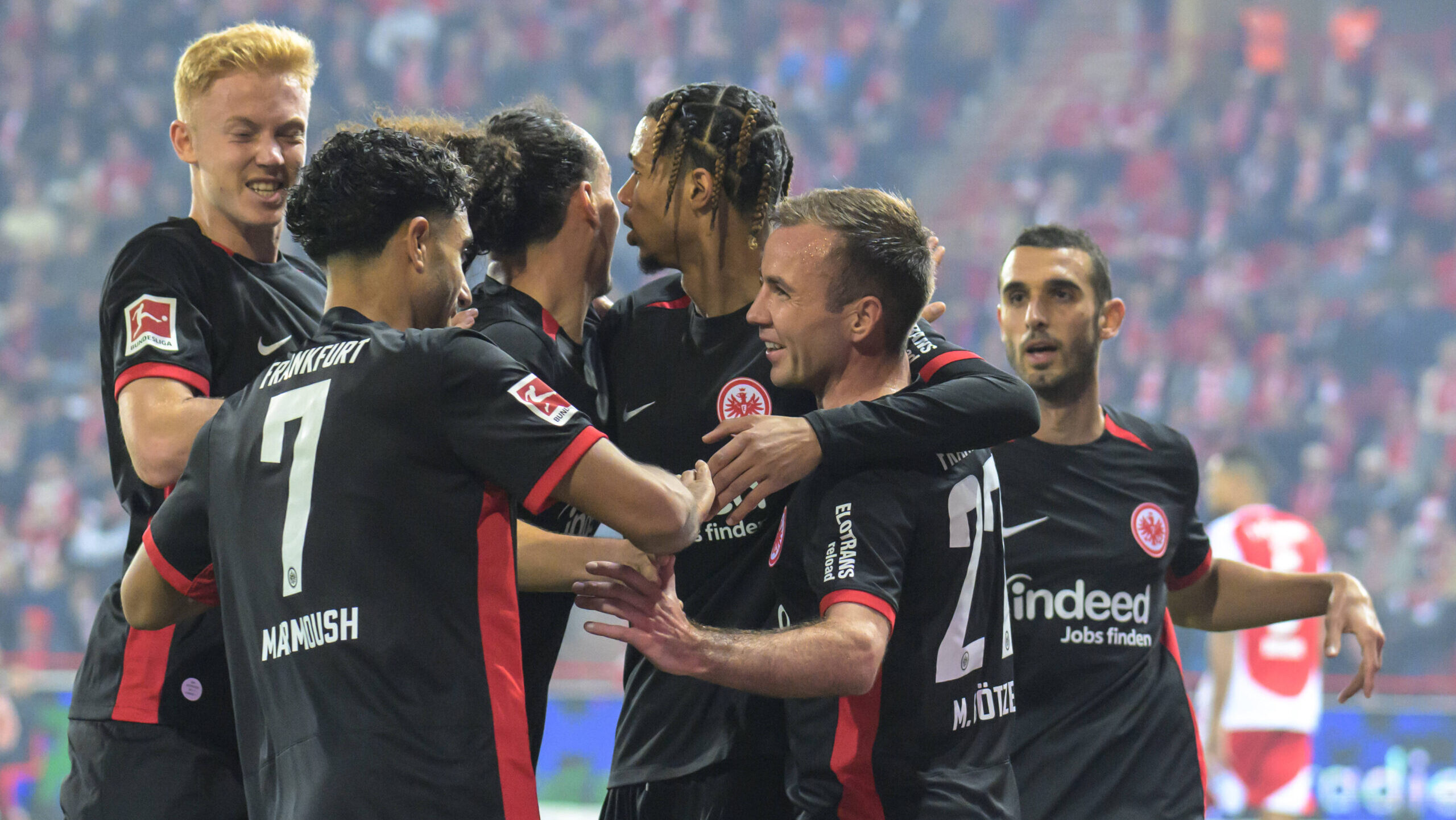 GER, Berlin, 1. FC Union Berlin vs Eintracht Frankfurt - SGE, 1. Bundesliga, Fussball, DFB, Spielzeit 2024/2025, Alte Foersterei, 8. Spieltag, im Bild v.l.: Arthur Theate SGE, 03, Hugo Ekitike SGE, 11, Mario Goetze SGE, 27, Tor, Treffer, Jubel, Torjubel, Freude, Begeisterung, feiert, Tor, Treffer, 0:1, Mario Goetze SGE, 27, DFB/DFL REGULATIONS PROHIBIT ANY USE OF PHOTOGRAPHS AS IMAGE SEQUENCES AND/OR QUASI-VIDEO, 27.10.2024, *** GER, Berlin, 1 FC Union Berlin vs Eintracht Frankfurt SGE, 1 Bundesliga, Football, DFB, Season 2024 2025, Alte Foersterei, Matchday 8, in the picture from l Arthur Theate SGE, 03 , Hugo Ekitike SGE, 11 , Mario Goetze SGE, 27 , goal, goal, jubilation, goal celebration, joy, enthusiasm, celebrates, goal, goal, 0 1, Mario Goetze SGE, 27 , DFB DFL REGULATIONS PROHIBIT ANY USE OF PHOTOGRAPHS AS IMAGE SEQUENCES AND OR QUASI VIDEO, 27 10 2024, Copyright: HMBxMedia/UwexKoch