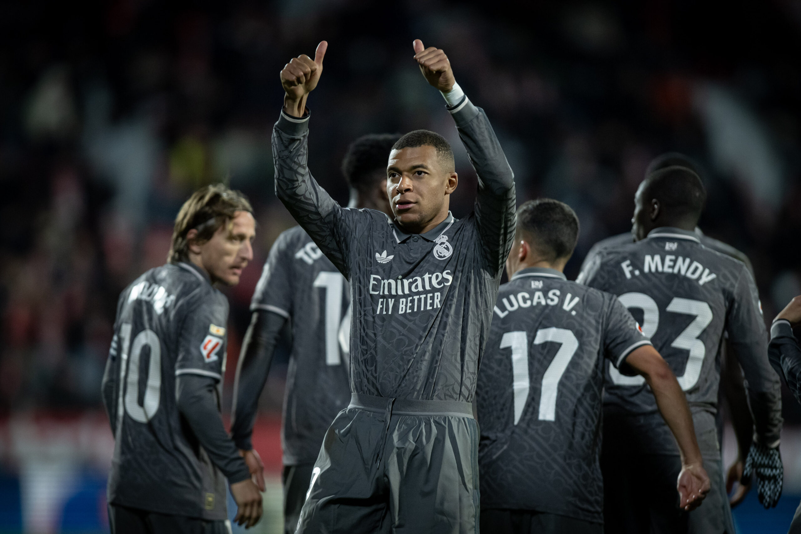 Killian MbappŽ (Real Madrid CF) celebrates after scoring his team's goal with team mates during a La Liga EA Sports match between Girona FC and Real Madrid at Estadi Municipal de Montilivi in Girona, Girona, Spain, on December 07 2024. Photo by Felipe Mondino / Sipa USA