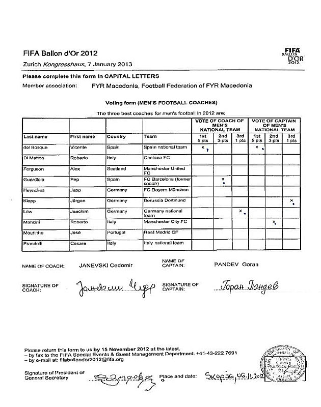 Oczywiście FIFA odpiera zarzuty i twierdzi, że wszystko odbyło się uczciwie. Na dowód tego opublikowana została karta głosowania, na której widać, że Pandev wyróżnił Vicente del Bosque, Roberto Manciniego oraz Juergena Kloppa. Teraz pytanie: czy ta karta nie została sfałszowana? Zapewne sprawa będzie miała swój ciąg dalszy.
