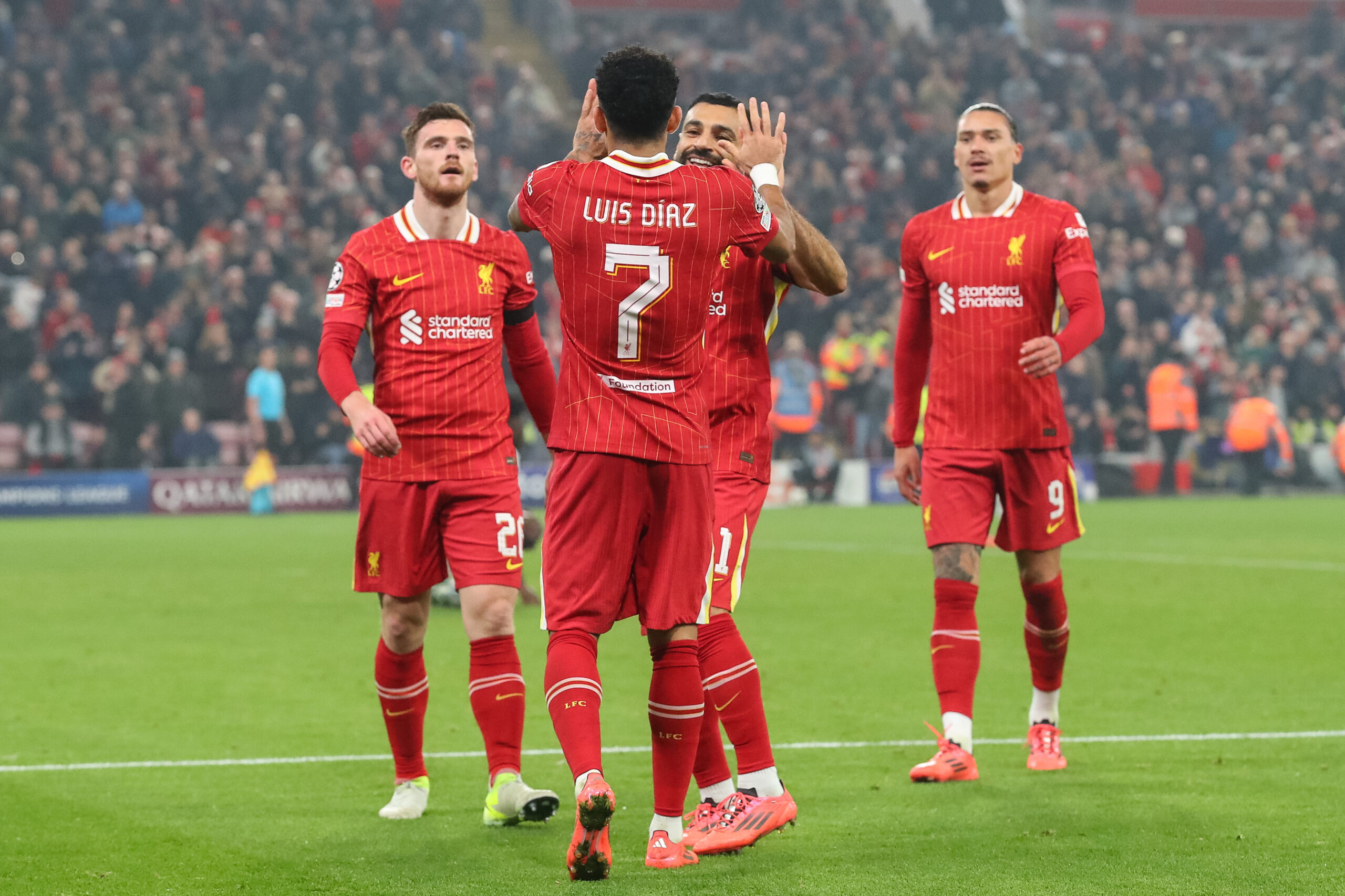 Luis D’az of Liverpool celebrates his hat-trick goal to make it 4-0 during the UEFA Champions League, League Stage match Liverpool vs Bayer 04 Leverkusen at Anfield, Liverpool, United Kingdom, 5th November 2024