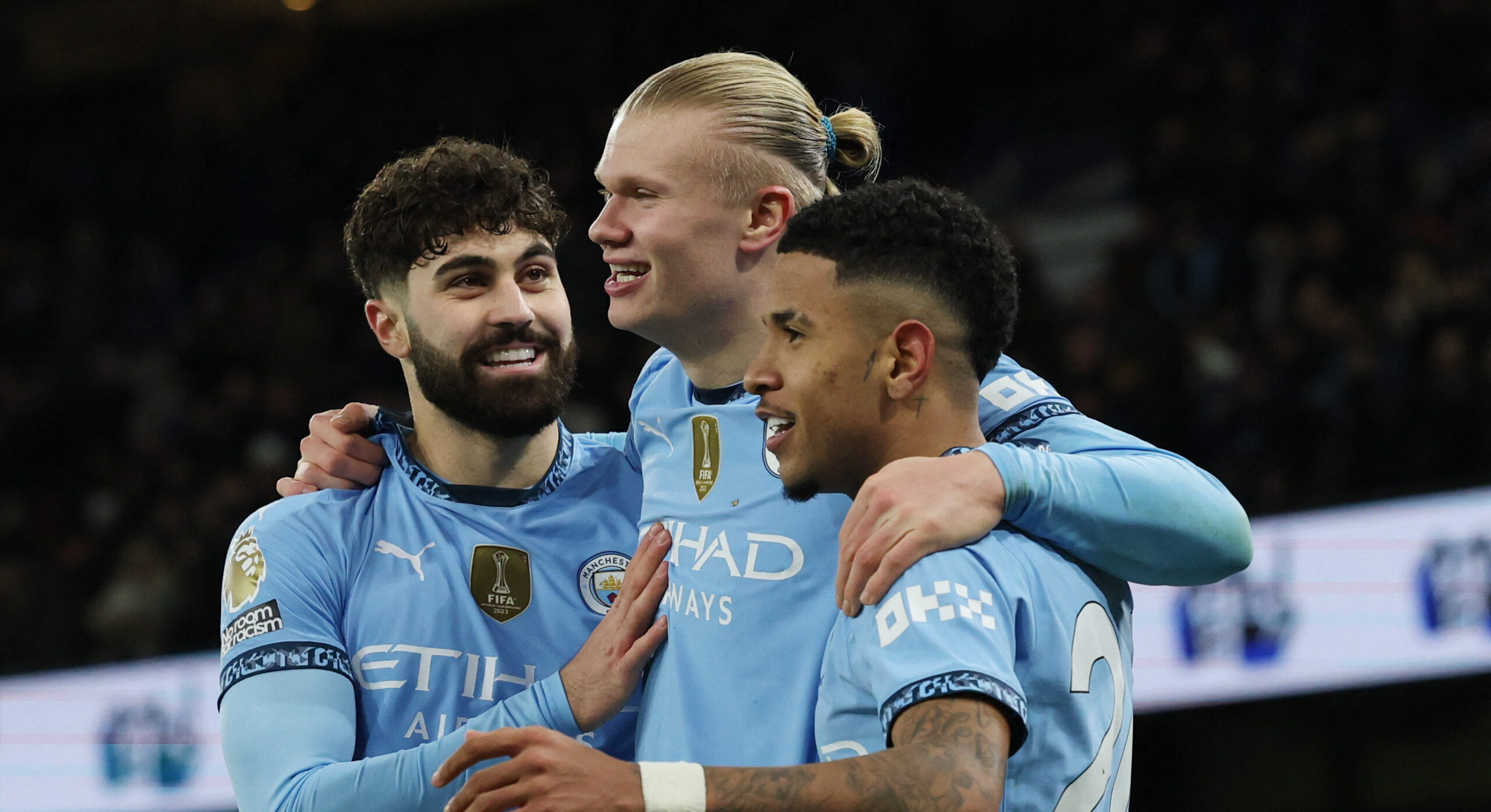 Soccer Football - Premier League - Manchester City v West Ham United - Etihad Stadium, Manchester, Britain - January 4, 2025 Manchester City's Erling Haaland celebrates scoring their third goal with Savinho and Josko Gvardiol  EDITORIAL USE ONLY. NO USE WITH UNAUTHORIZED AUDIO, VIDEO, DATA, FIXTURE LISTS, CLUB/LEAGUE LOGOS OR 'LIVE' SERVICES. ONLINE IN-MATCH USE LIMITED TO 120 IMAGES, NO VIDEO EMULATION. NO USE IN BETTING, GAMES OR SINGLE CLUB/LEAGUE/PLAYER PUBLICATIONS. PLEASE CONTACT YOUR ACCOUNT REPRESENTATIVE FOR FURTHER DETAILS..,Image: 951753362, License: Rights-managed, Restrictions: NO USE WITH UNAUTHORIZED AUDIO, VIDEO, DATA, FIXTURE LISTS, CLUB/LEAGUE LOGOS OR “LIVE” SERVICES. ONLINE IN-MATCH USE LIMITED TO 45 IMAGES, NO VIDEO EMULATION. NO USE IN BETTING, GAMES OR SINGLE CLUB/LEAGUE/PLAYER PUBLICATIONS., Model Release: no, Credit line: Phil Noble / Reuters / Forum