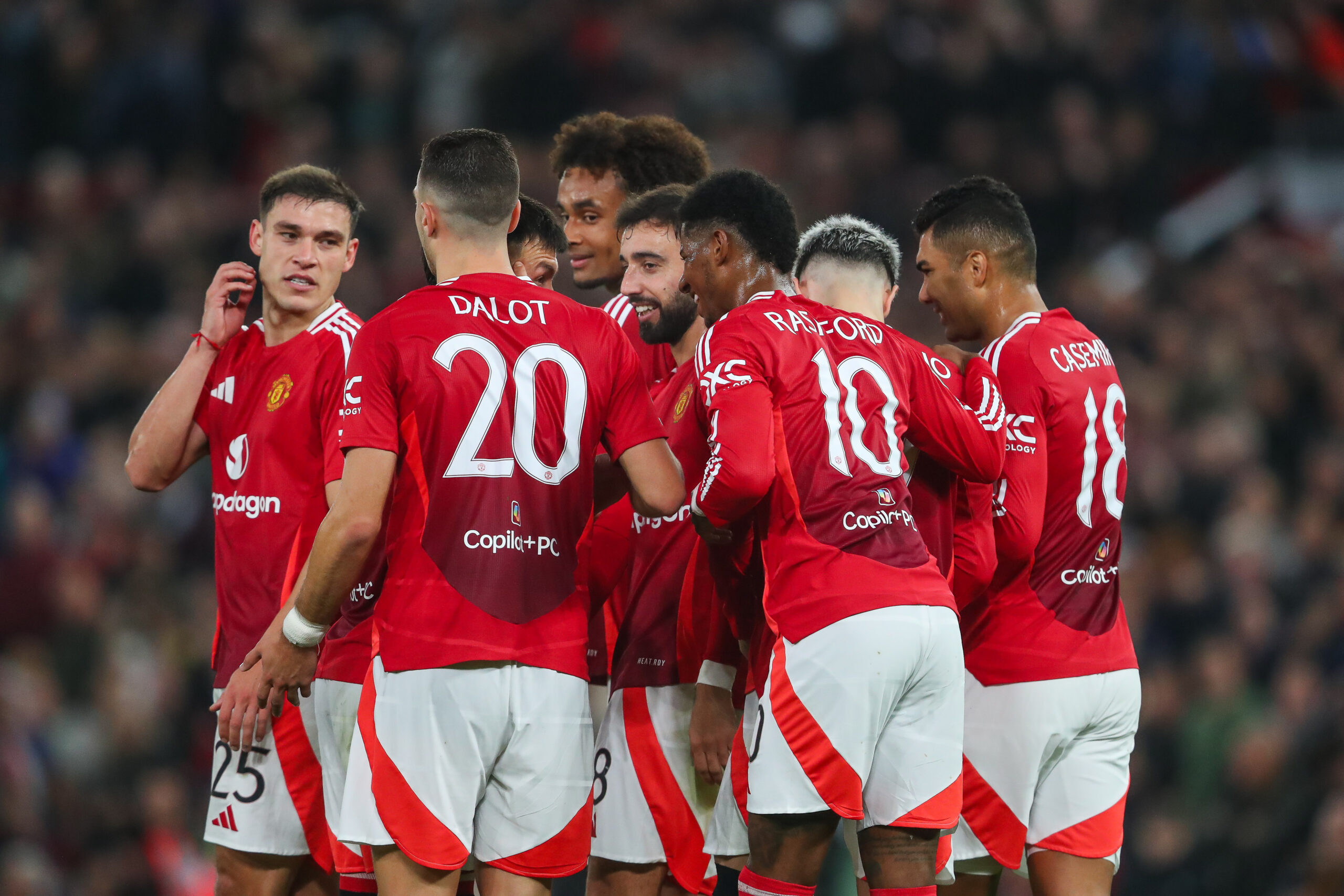 Bruno Fernandes of Manchester United celebrates his goal to make it 3-1 during the Carabao Cup Last 16 match Manchester United vs Leicester City at Old Trafford, Manchester, United Kingdom, 30th October 2024