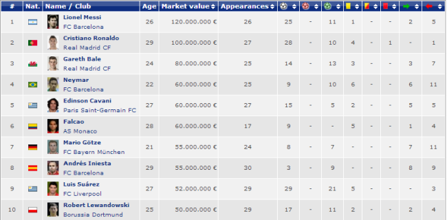 Co ciekawe, pierwszą dziesiątkę zamyka reprezentant Polski, przyszły napastnik Bayernu Monachium Robert Lewandowski. Jego wartość oszacowano na 50 milionów euro. Na tym samym pułapie znaleźli się Mesut Oezil z Arsenalu i Cesc Fabregas z Barcelony.