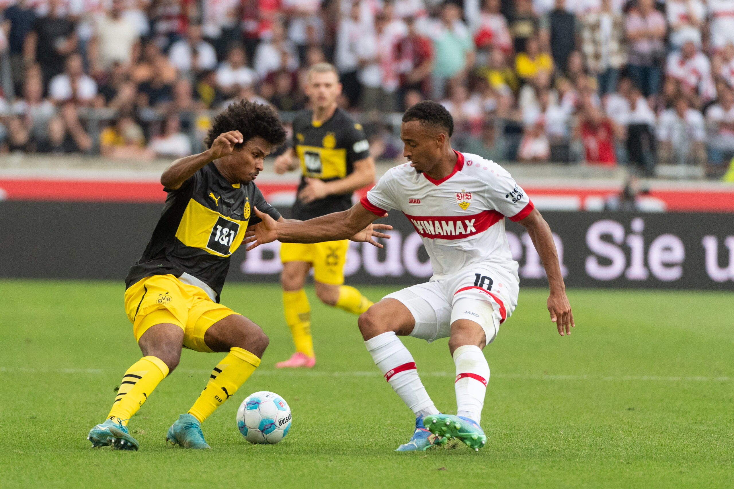 22.09.2024, Mercedes Benz Arena, Stuttgart, GER, 1. FBL, VfB Stuttgart vs Borussia Dortmund, 4. Runde, im Bild v.li. Karim Adeyemi (Borussia Dortmund, #27), Jamie Leweling (VfB Stuttgart #18) // during the German Bundesliga 4th round match between VfB Stuttgart and Borussia Dortmund at the Mercedes Benz Arena in Stuttgart, Germany on 2024/09/22. EXPA Pictures © 2024, PhotoCredit: EXPA/ Eibner-Pressefoto/ Wolfgang Frank