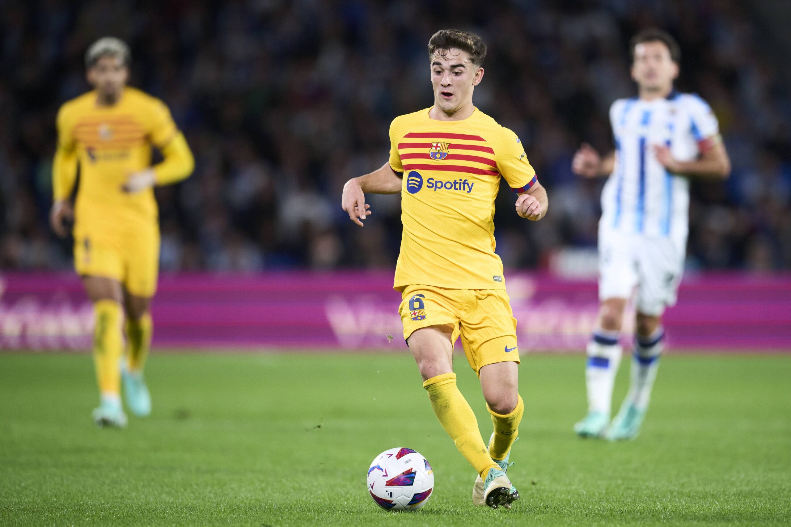 Pablo Martin 'Gavi’ of FC Barcelona during the La Liga EA Sports match between Real Sociedad and FC Barcelona played at Reale Arena Stadium on November 04, 2023 in San Sebastian, Spain. (Photo by Cesar Ortiz / PRESSINPHOTO)