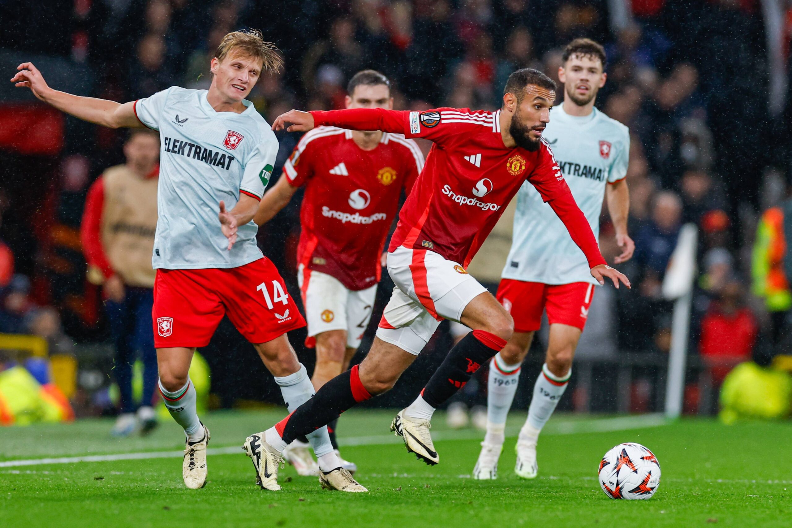 Noussair Mazraoui of Manchester United dribbles with the ball, defends by Sem Steijn of FC Twente during the UEFA Europa League 2024/25 League Phase MD1 match between Manchester United v FC Twente at Old Trafford on September 25, 2024 in Manchester, England.  (Photo by Marcel ter Bals/DeFodi Images)