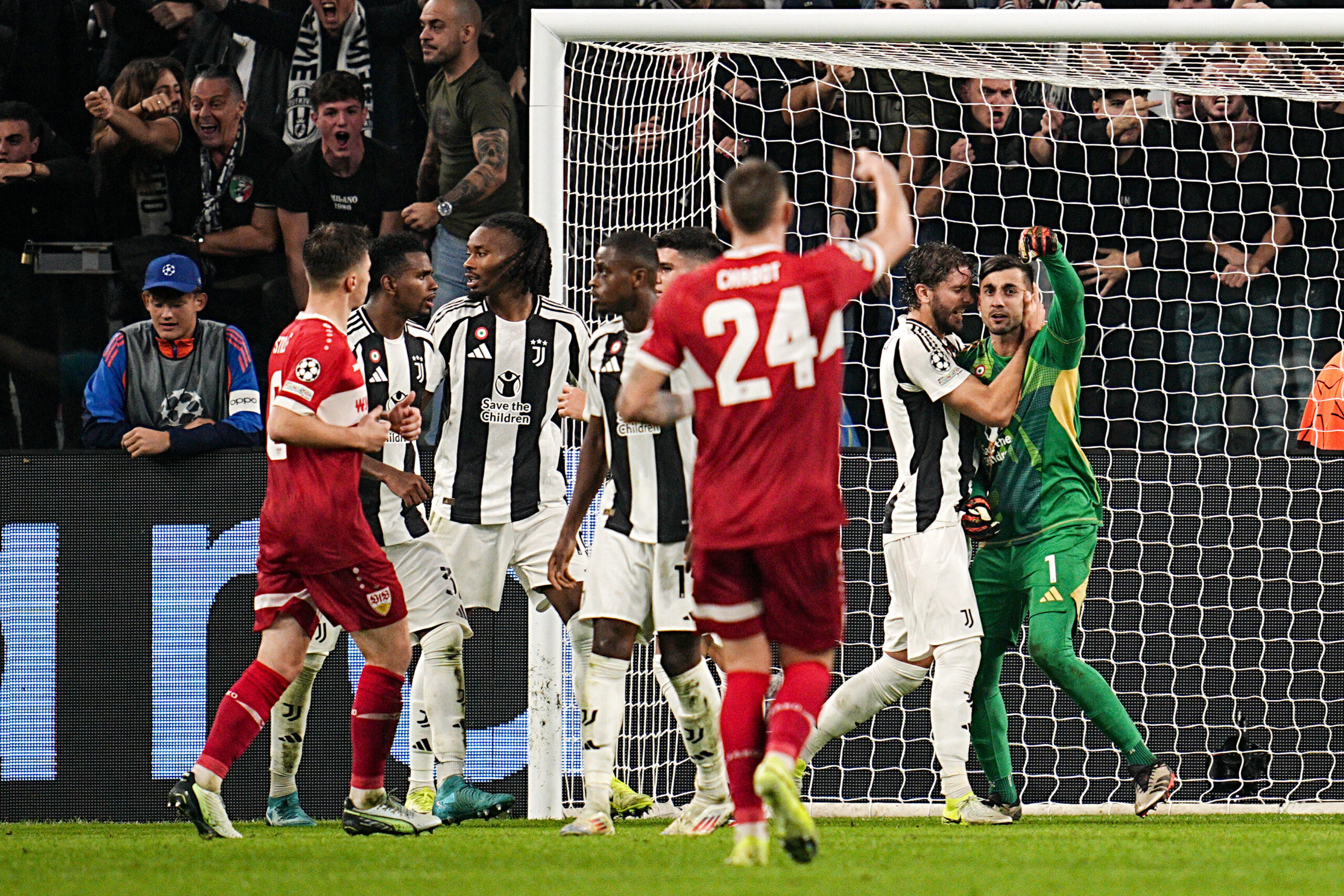 JuventusÕ goalkeeper Mattia Perin reacts after saving a penalty  during the Uefa Champions League soccer match, between Juventus and Stuttgart at the Allianz Stadium in Turin, north west Italy - Tuesday, October 22, 2024. Sport - Soccer (Photo by Marco Alpozzi/Lapresse) (Photo by Marco Alpozzi/LaPresse/Sipa USA)