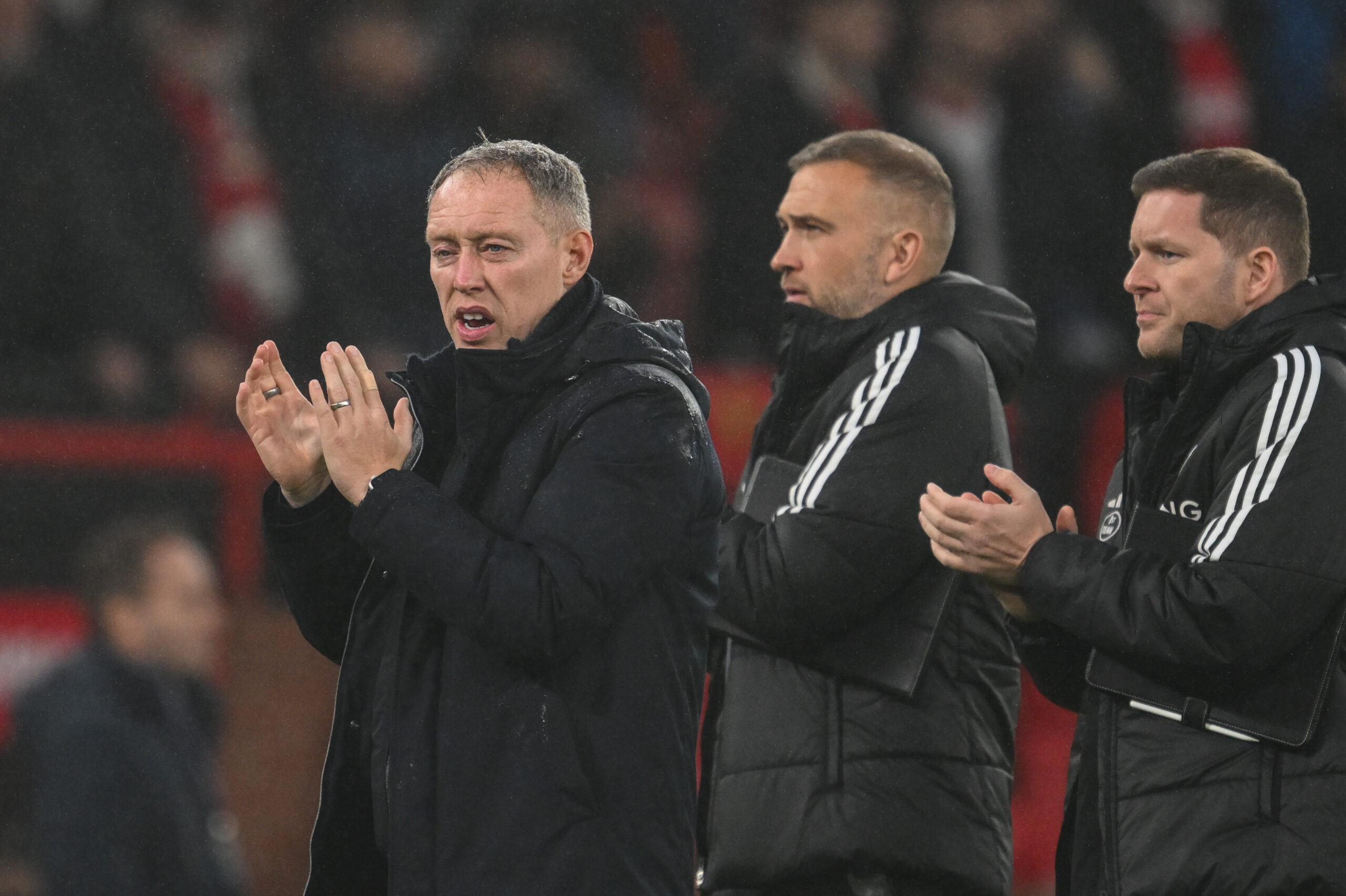 Steve Cooper manager of Leicester City applauds the travelling fans after the Premier League match Manchester United vs Leicester City at Old Trafford, Manchester, United Kingdom, 10th November 2024