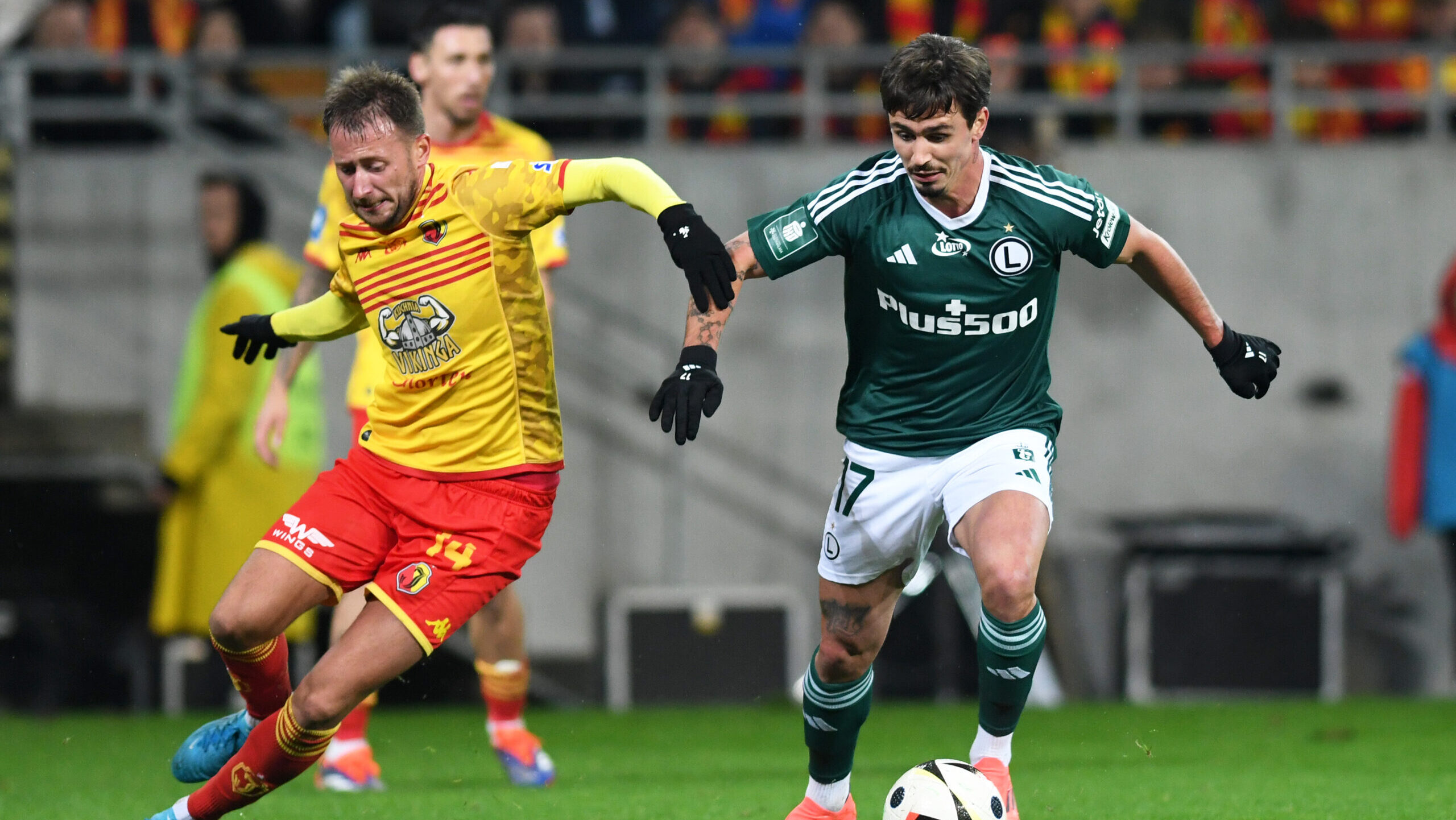 2024.10.06 Bialystok Pilka nozna PKO Ekstraklasa sezon 2024/2025 11 kolejka rozgrywek Jagiellonia Bialystok (zolto-czerwone) - Legia Warszawa N/z (L-P) Jaroslaw Kubicki Migouel Alfarela Foto Michal Kosc / PressFocus
