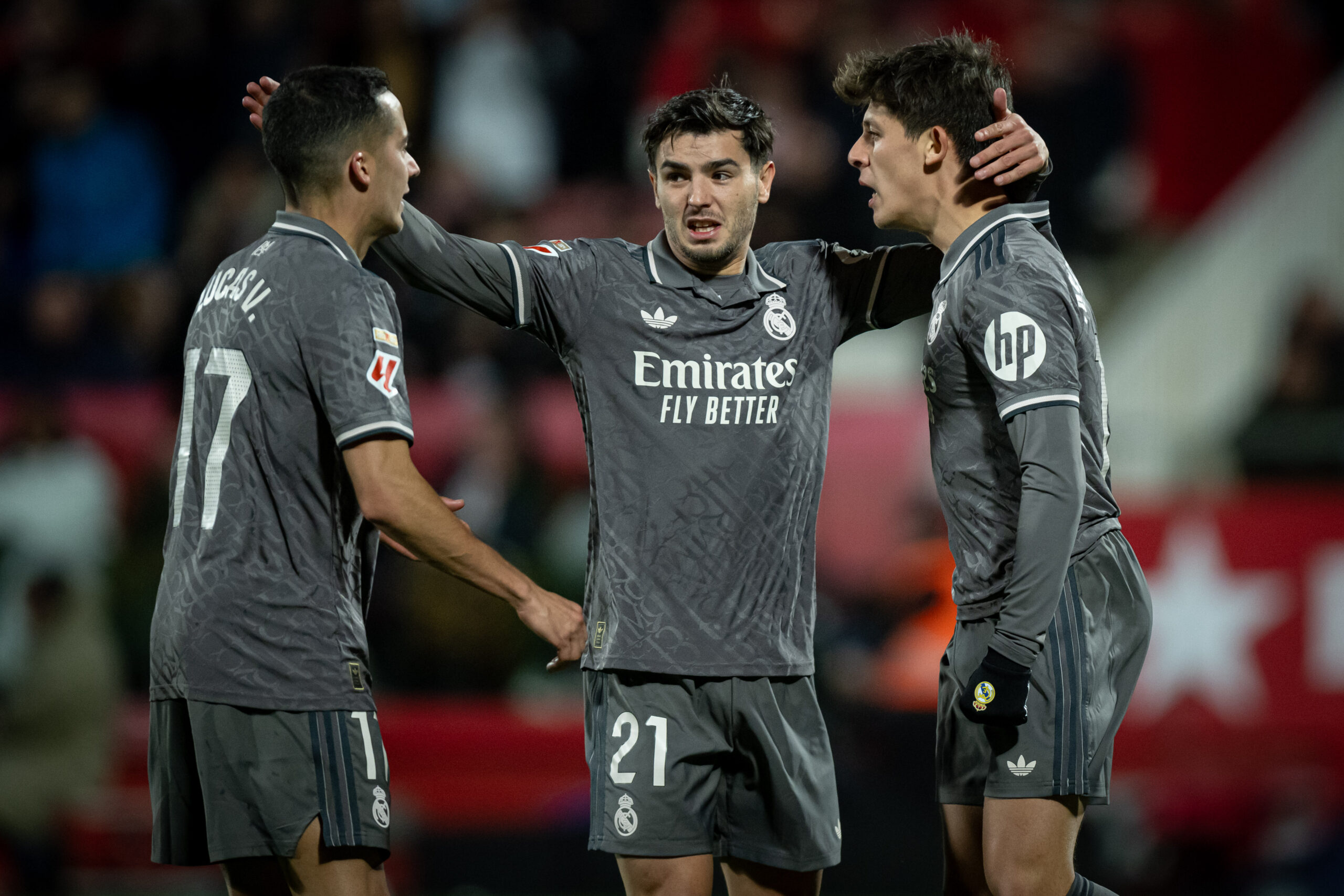 Arda GŸler (Real Madrid CF) celebrates after scoring his team's goal with team mates during a La Liga EA Sports match between Girona FC and Real Madrid at Estadi Municipal de Montilivi in Girona, Girona, Spain, on December 07 2024. Photo by Felipe Mondino / Sipa USA