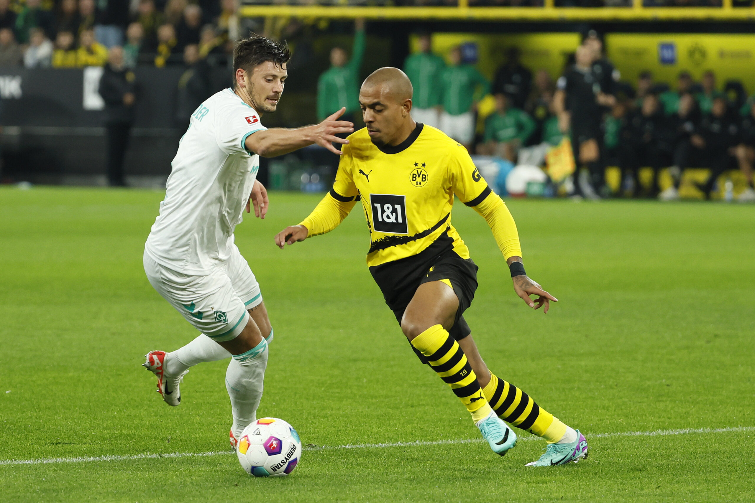 (231021) -- DORTMUND, Oct. 21, 2023 (Xinhua) -- Donyell Malen (R) of Borussia Dortmund vies with Dawid Kownacki of SV Werder Bremen during the first division of Bundesliga match between Borussia Dortmund and SV Werder Bremen in Dortmund, Germany, Oct. 20, 2023. (Photo by Joachim Bywaletz/Xinhua)
