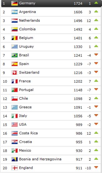 Duży spadek zanotowała Hiszpania, która wylądowała na ósmym miejscu. O siedem pozycji spadła też Portugalia, która obecnie jest 11. Jeszcze gorzej wygląda sytuacja Anglii, która z 10. spadła na 20. miejsce.