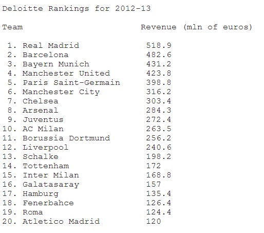 Real Madryt może się pochwalić największymi dochodami spośród klubów piłkarskich za sezon 2012-13. Królewscy po raz dziewiąty z rzędu zajęli pierwsze miejsce w specjalnym raporcie przygotowanym przez firmę Deloitte.