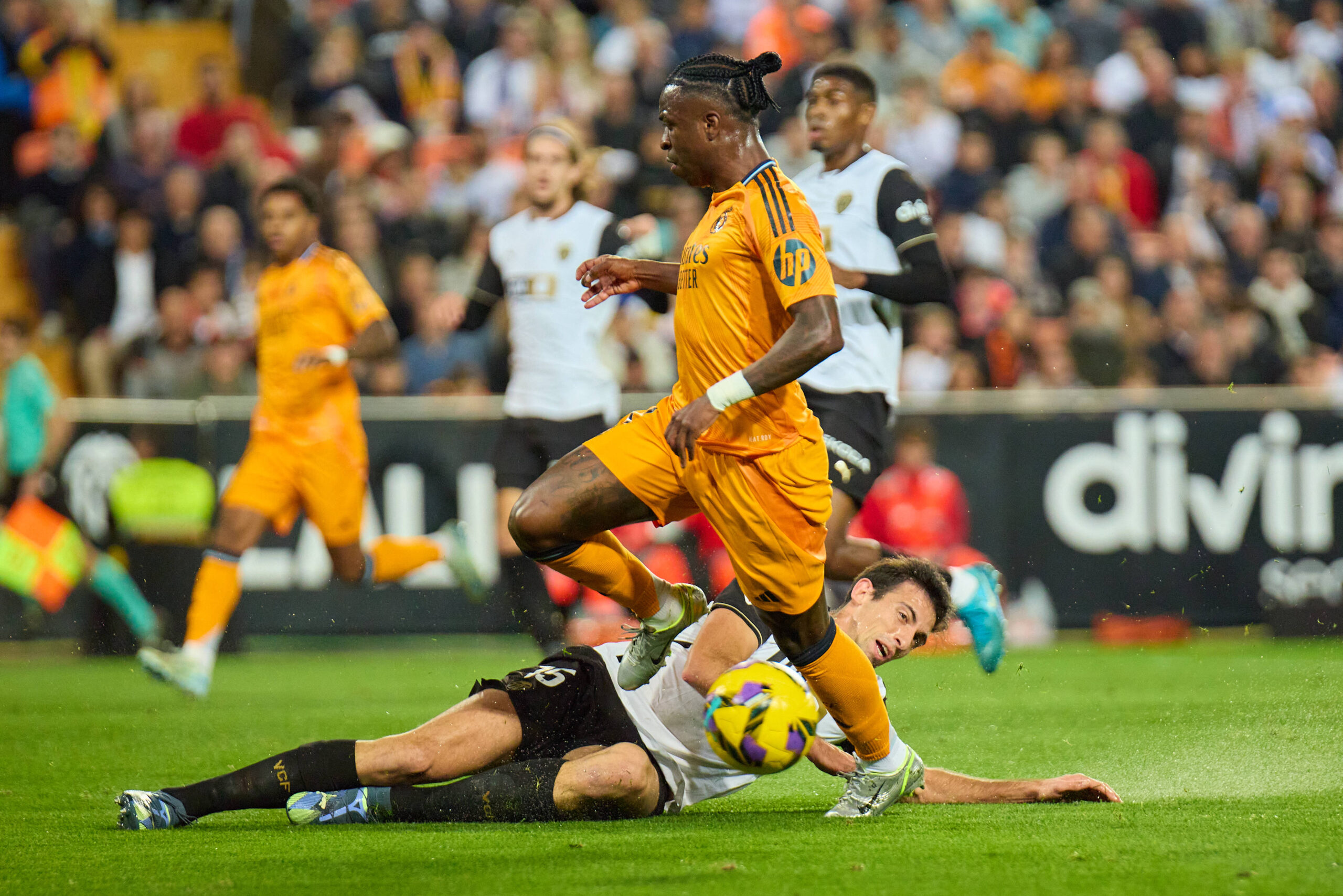 LaLiga EA Sports, Spain, Valencia CF v Real Madrid VALENCIA, SPAIN - JANUARY 3: Vinicius Junior left winger of Real Madrid competes for the ball with Cesar Tarrega Centre-Back of Valencia CF during the LaLiga EA Sports match between Valencia CF and Real Madrid at Mestalla Stadium on January 3, 2025 in Valencia, Spain. match of round 12 of LaLiga that was postponed due to heavy rains in valencia Photo by Jose Torres/Photo Players Images/Magara Press Valencia Mestalla Stadium Spain Copyright: xJosexTorresx