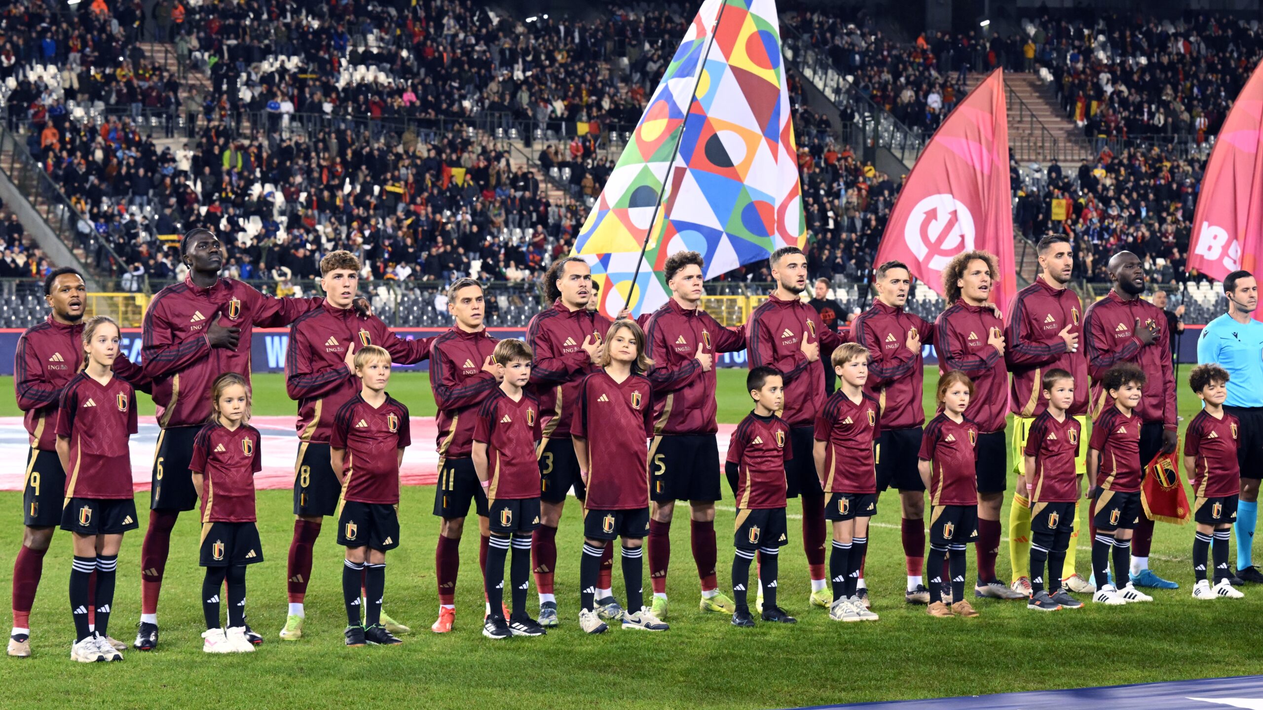 11/14/2024 - BRUSSELS - (l-r) Lois Openda of Belgium, Amadou Onana of Belgium, Arne Engels of Belgium, Leandro Trossard of Belgium, Arthur Theate of Belgium, Maxim de Cuyper of Belgium, Zeno Debast of Belgium, Timothy Castagne of Belgium, Wout Faes of Belgium, Belgium goalkeeper Koen Kasteels, Romelu Lukaku of Belgium during the UEFA Nations League match between Belgium and Italy at the King Baudouin Stadium on Nov. 14, 2024 in Brussels, Belgium. ANP | Hollandse Hoogte | GERRIT VAN KEULEN /ANP/Sipa USA