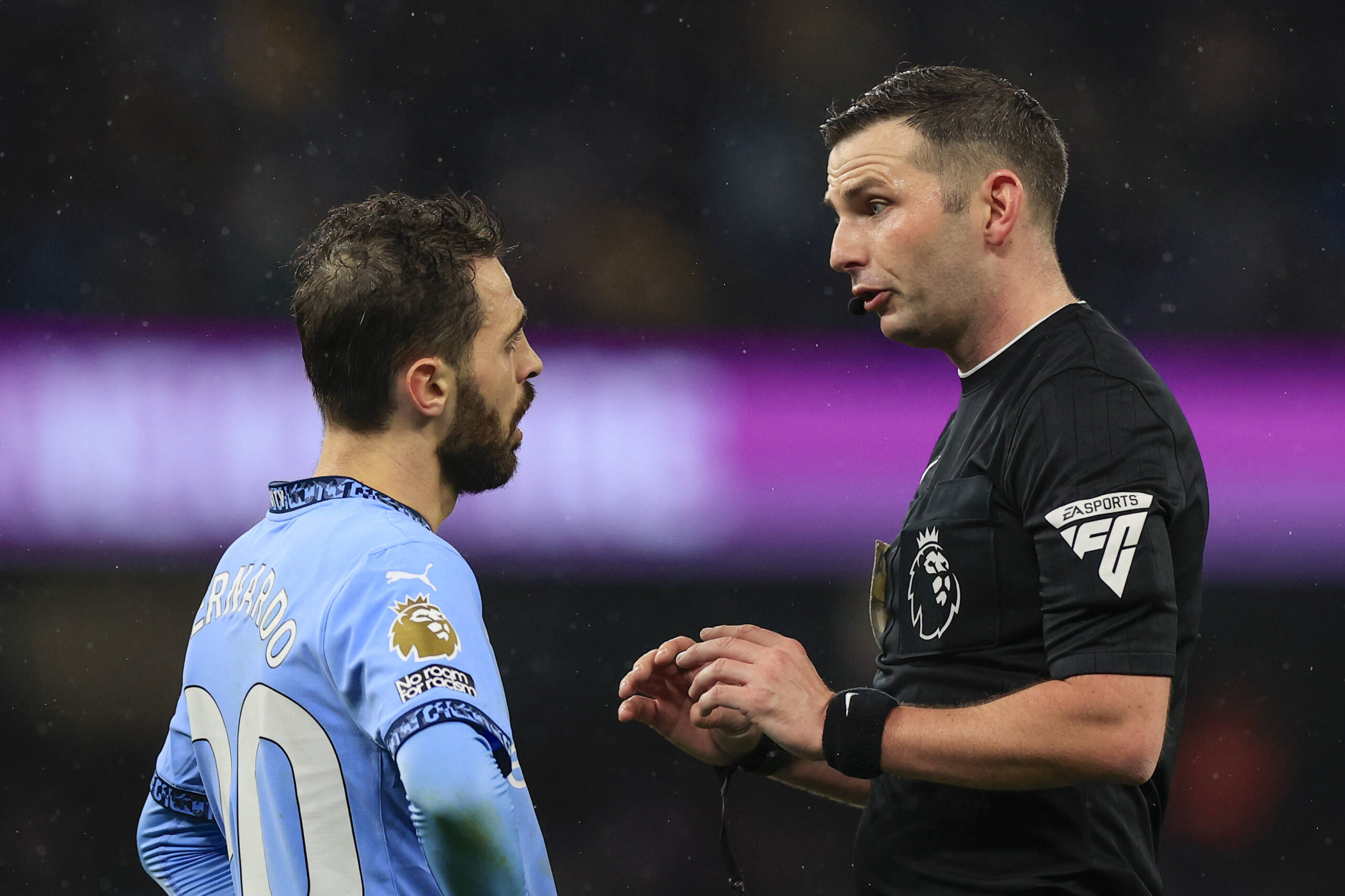 Manchester City v Nottingham Forest Premier League 04/12/2024. Referee Michael Oliver has a chat with Bernardo Silva 20 of Manchester City during the Premier League match between Manchester City and Nottingham Forest at the Etihad Stadium, Manchester, England on 4 December 2024. Manchester Etihad Stadium Manchester England Editorial use only DataCo restrictions apply See www.football-dataco.com , Copyright: xConorxMolloyx PSI-20946-0043