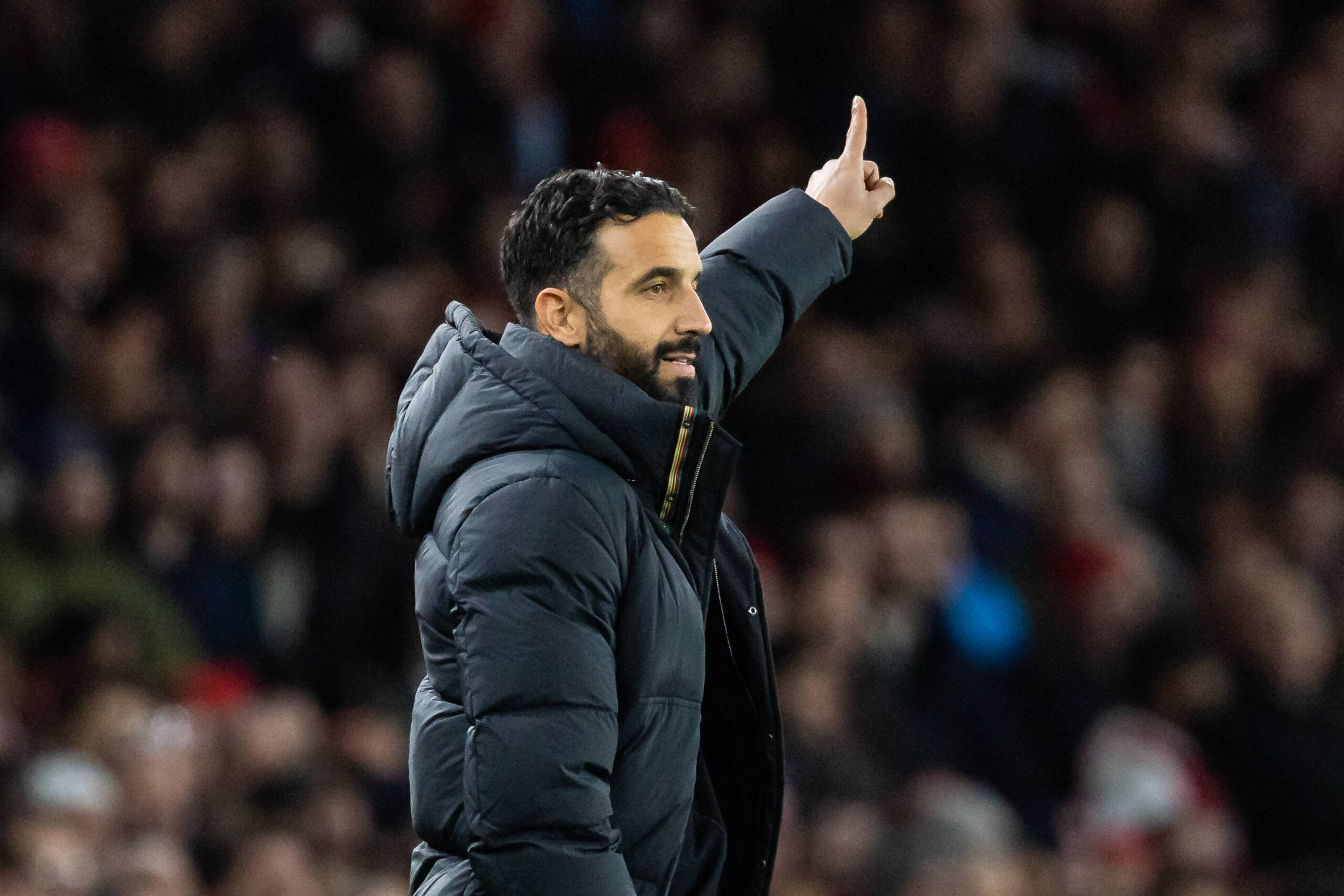 Football - 2024 / 2025 Premier League - Arsenal vs Manchester United, ManU - Emirates Stadium - Wednesday 4th December 2024 Ruben Amorim, manager of Manchester United, points in the direction he woud like his team to go at the Emirates Stadium COLORSPORT/DANIEL BEARHAM PUBLICATIONxNOTxINxUK csp_ars_manu db_04122024_