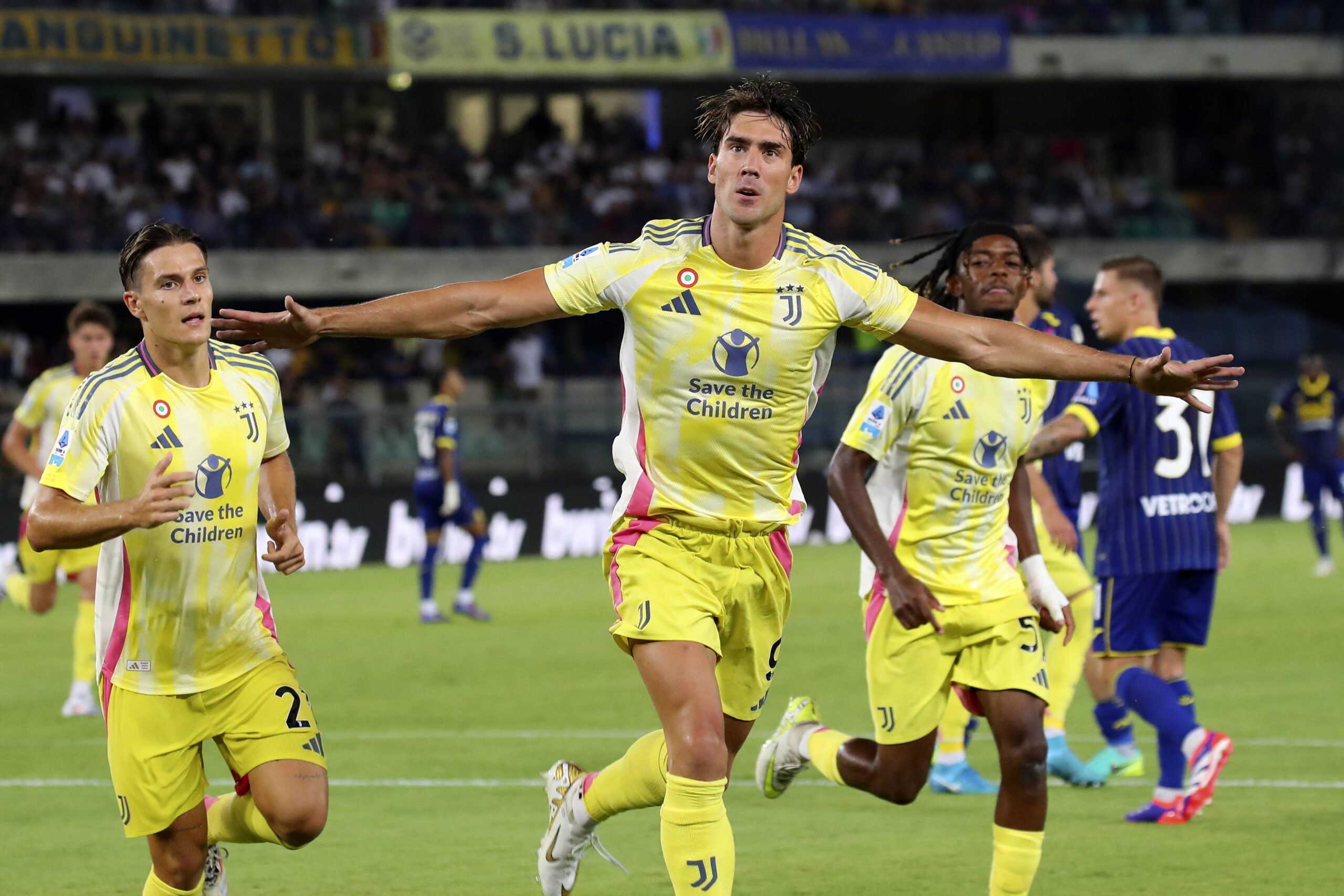 August 26, 2024, Verona, Vr, Italia: Dusan Vlahovic (9 Juventus FC) celebration goal penalty 0-3) in action  during the  Serie A enilive soccer match between Hellas Verona  and Juventus at the Marcantonio Bentegodi Stadium, north Est Italy - Monday, August  26, 2024. Sport - Soccer (Photo by Paola Garbuio /Lapresse) (Credit Image: © Paola Garbuio/LaPresse via ZUMA Press)