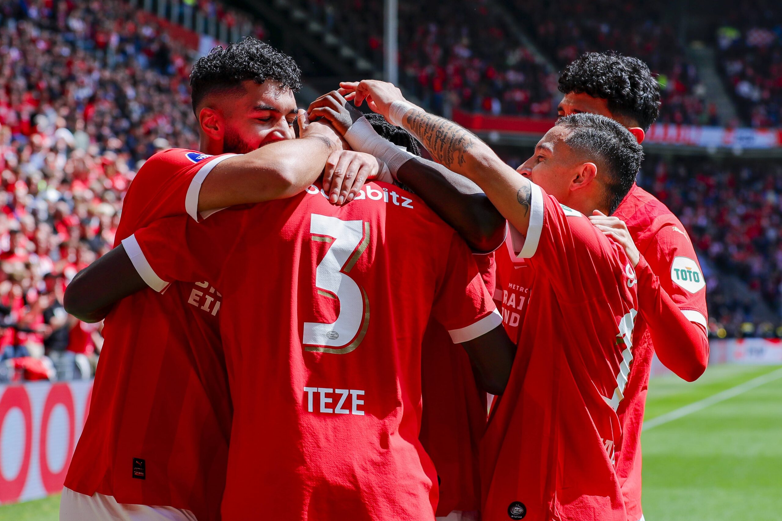 Eindhoven, Netherlands, 05.05.2024: Jordan Teze (PSV Eindhoven) scores the 4-2 Celebrates after scoring his teams 4-2 goal during the Eredivisie match between PSV Eindhoven vs Sparta Rotterdam at the Philips stadium on May 5, 2024 in Eindhoven, Netherlands. (Photo by NESimages/Perry vd Leuvert/DeFodi Images)