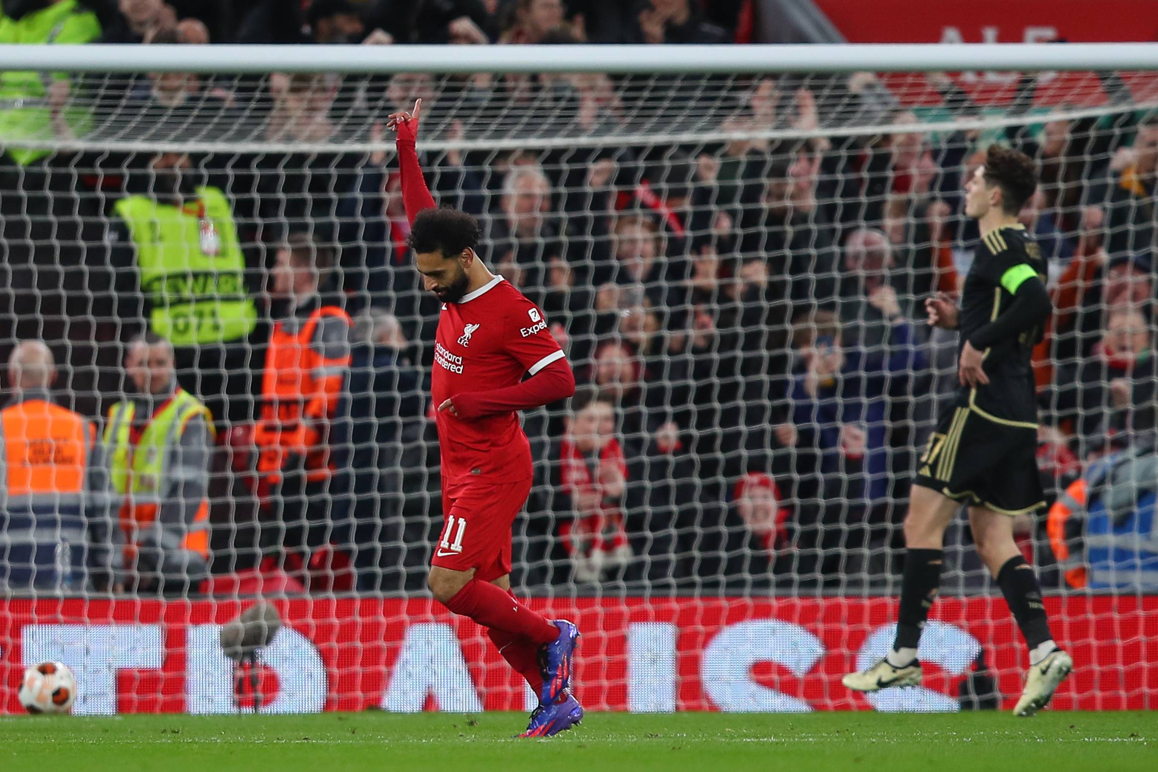 March 14, 2024, Liverpool, Merseyside, United Kingdom: Mohamed Salah of Liverpool celebrates his goal to make it 3-0 Liverpool, during the UEFA Europa League match Liverpool vs Sparta Prague at Anfield, Liverpool, United Kingdom, 14th March 2024. (Credit Image: © Gareth Evans/News Images via ZUMA Press Wire)