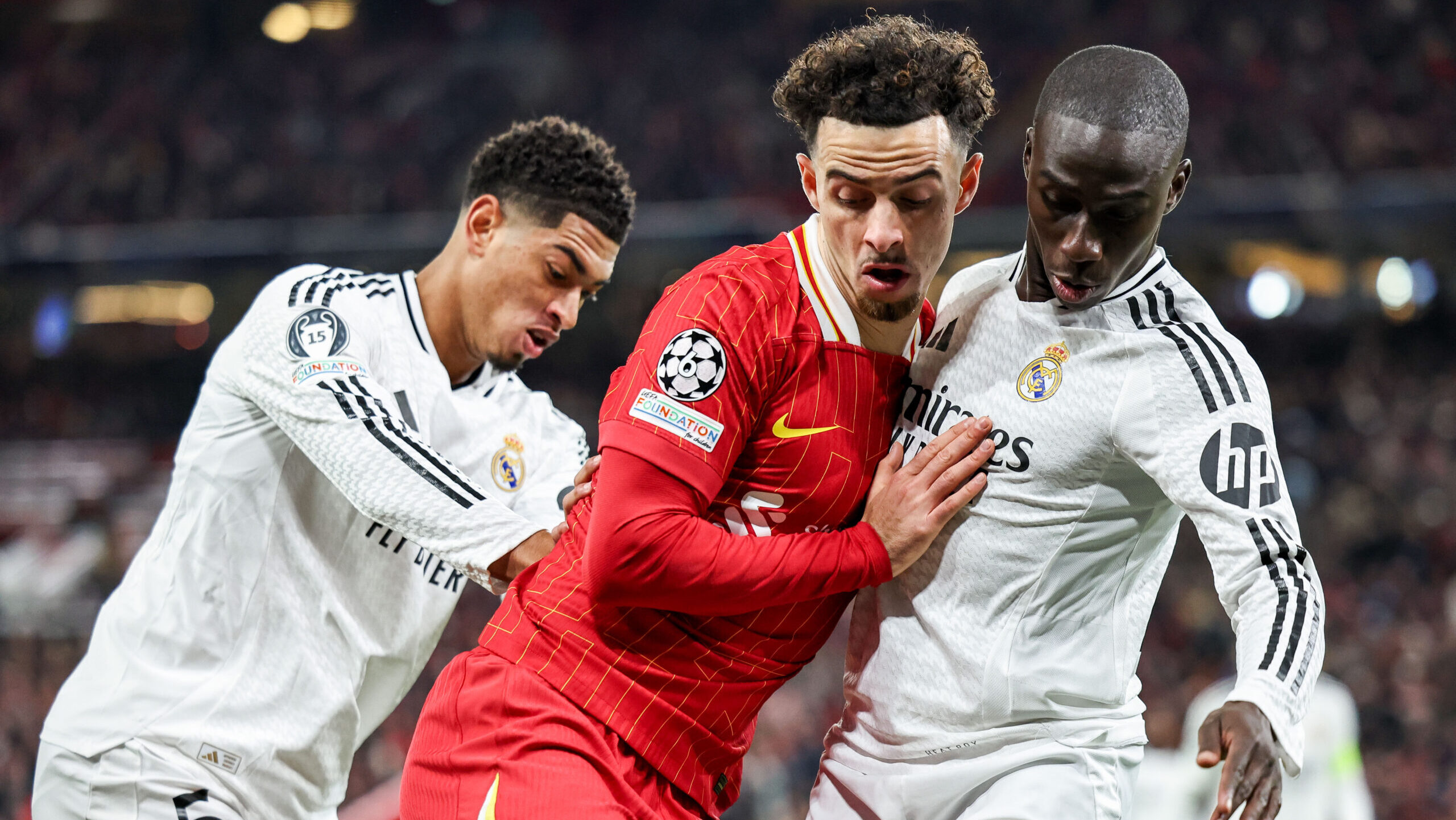 Curtis Jones of Liverpool battles for the ball with Jude Bellingham of Real Madrid and Ferland Mendy during the UEFA Champions League, League Phase MD5 Liverpool v Real Madrid at Anfield, Liverpool, United Kingdom, 27th November 2024