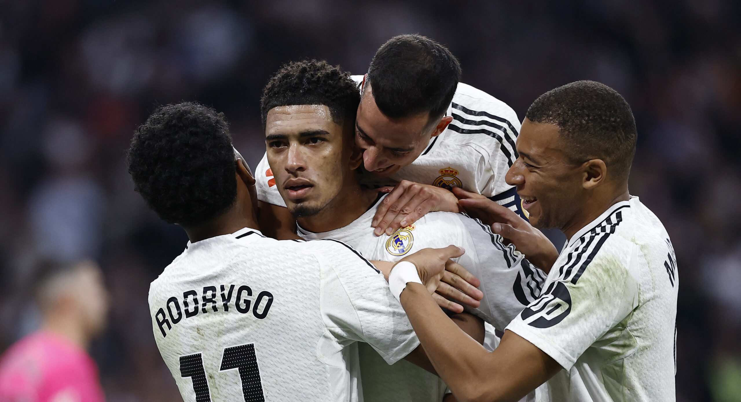 Soccer Football - LaLiga - Real Madrid v Getafe - Santiago Bernabeu, Madrid, Spain - December 1, 2024 Real Madrid's Jude Bellingham celebrates scoring their first goal with Lucas Vazquez, Kylian Mbappe and Rodrygo,Image: 941606598, License: Rights-managed, Restrictions: , Model Release: no, Credit line: Juan Medina / Reuters / Forum