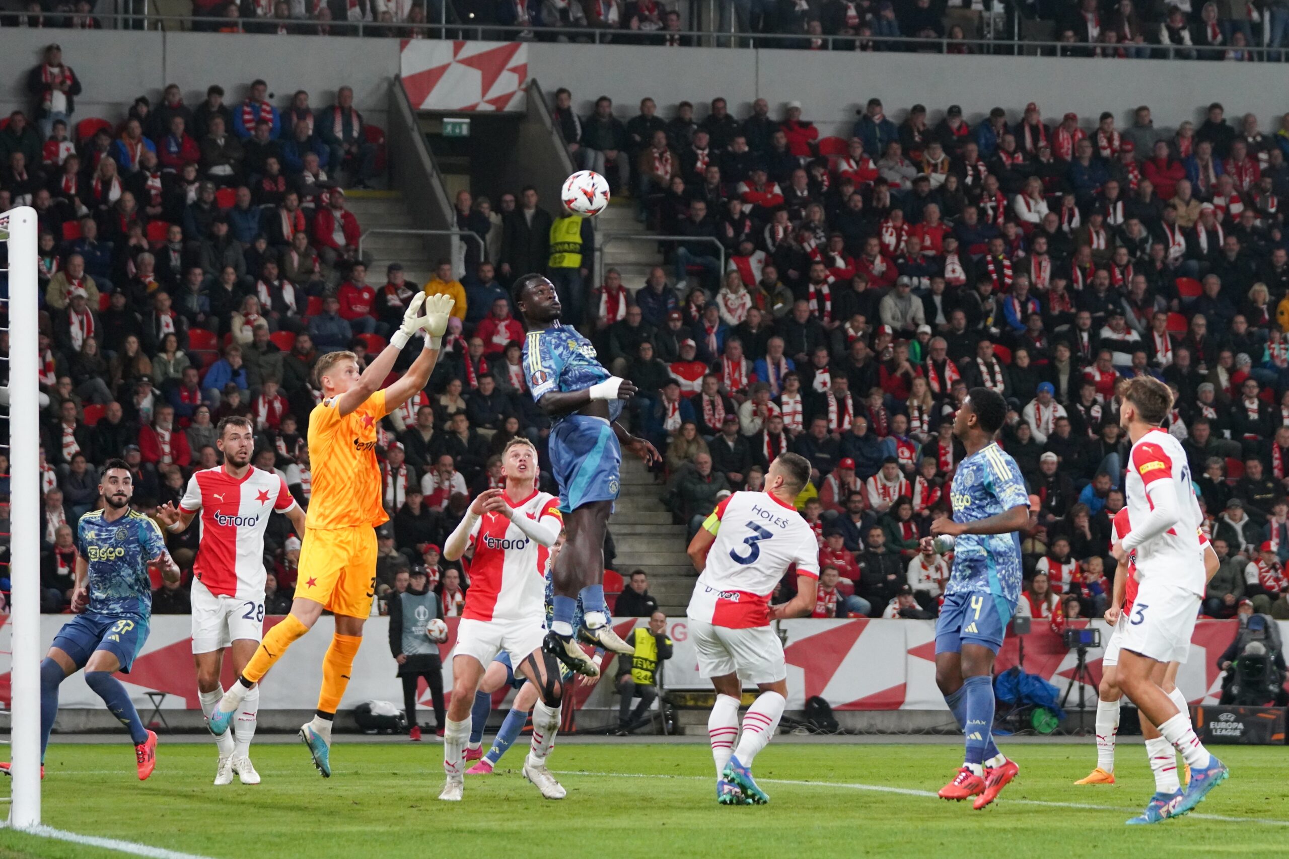 PRAGUE, 03-10-2024 , Eden Arena, football, UEFA Europa League, season 2024 / 2025, Match between Slavia Praag and Ajax , (L-R) Slavia Praag goalkeeper Antonín Kinsky, Ajax player Brian Brobbey (Photo by Pro Shots/Sipa USA)